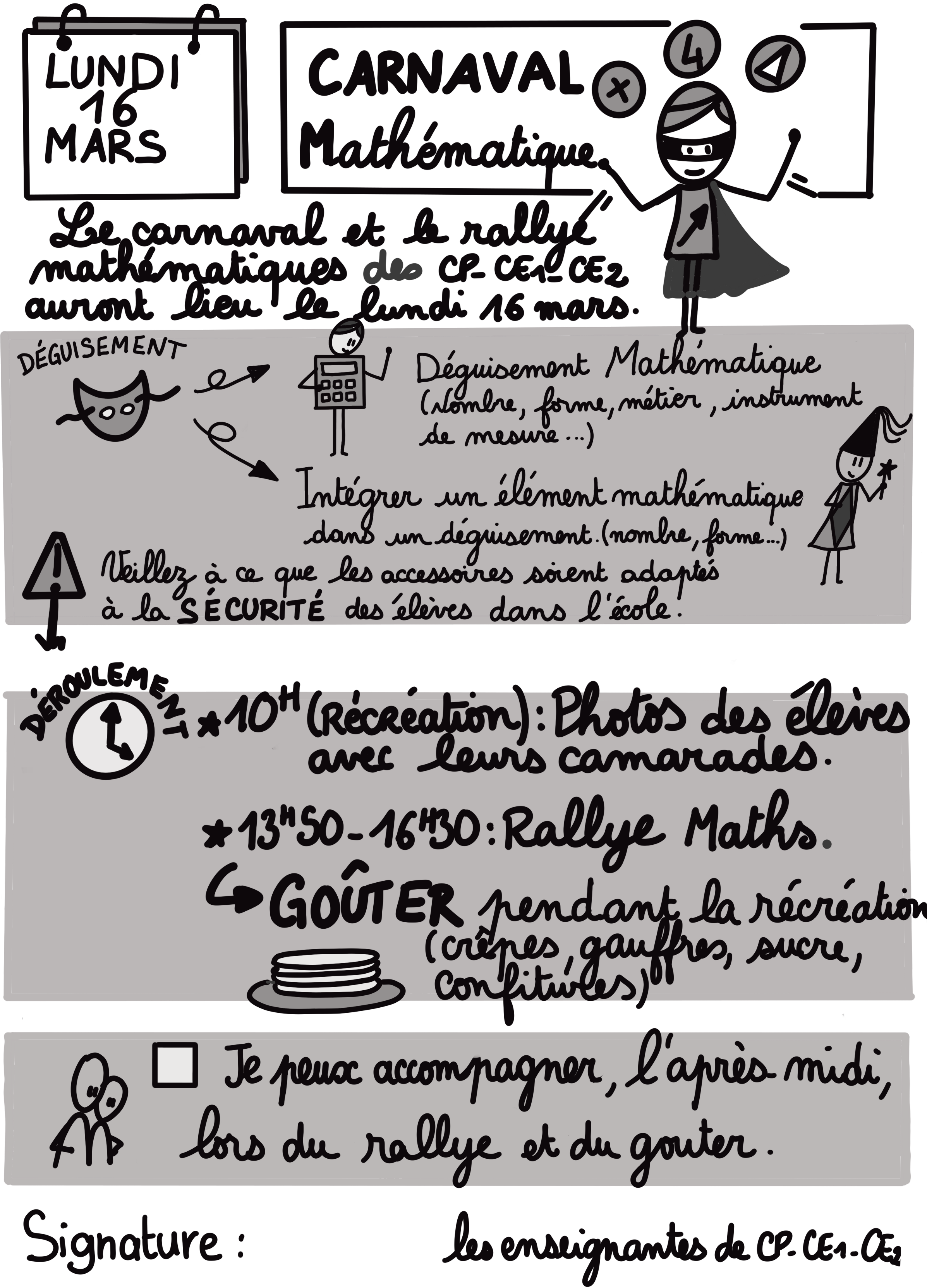 En classe, dans le cadre de la relation avec les familles, l’enseignante a pris l’habitude de sketchnoter les mots d’informations. Au moment de la distribution, l’accroche visuelle, ludique et humoristique capte l’attention de tous. Découvrir le document, le lire, constitue alors un vrai temps d’activité pour ces jeunes lecteurs, un moment d’écoute et d’échanges. Avant, les élèves collaient la feuille sans se sentir concernés, oubliant souvent les explications orales associées, et n’étaient pas tous, loin de là, capables d’en rendre compte à leurs parents. Aujourd’hui, ils se rappellent généralement quel est le sujet du document. Les jeunes lecteurs sont ainsi absolument inclus dans la boucle de communication. Les informations associées aux images sont aussi plus accessibles pour les parents non francophones. "Il est plus rare désormais que les mots ne soient pas signés", conclut l’enseignante sur ce sujet.