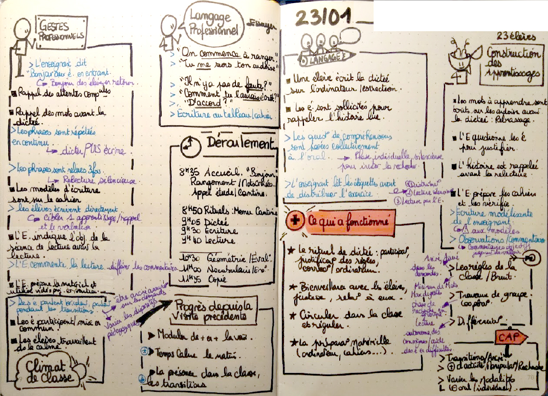 Dans le compte-rendu de la séance, M. Chainot-Bataille synthétise l’observation d’une matinée en classe en une seule page. Lors de l’entretien, le stagiaire s’approprie ainsi plus aisément le support de l’échange. Les indications en couleurs sont complétées avec le stagiaire au moment de l’entretien afin de fixer ce qui ressort de l’échange (explicitations du stagiaire sur sa pratique, conseils donnés etc.). Un exemplaire est remis au stagiaire. Du côté de la formatrice, le sketchnote constitue un outil facilitateur pour rédiger ensuite le compte-rendu formel de la visite.