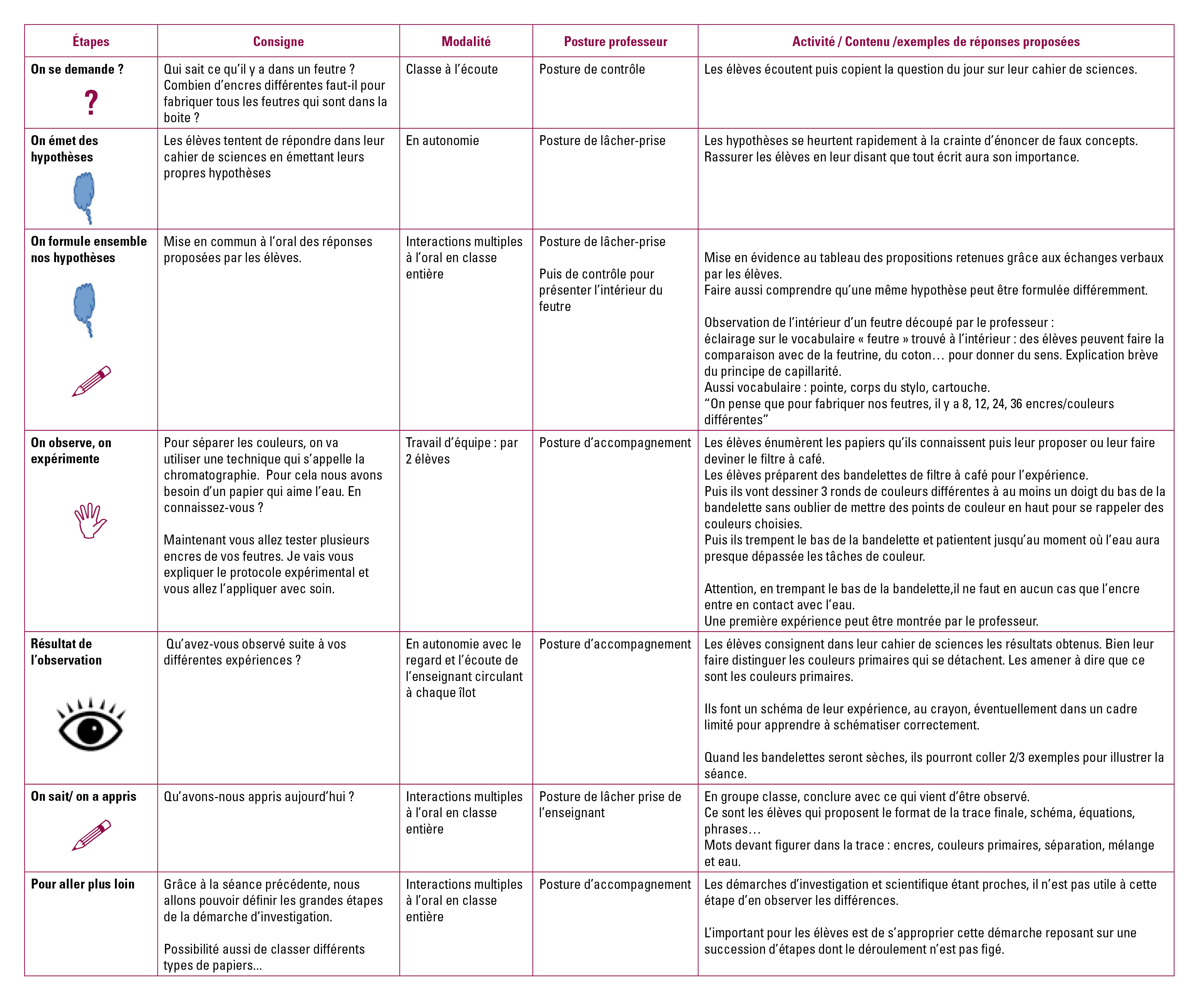 Déroulement de la séance “Chromatographie” Explications de l’enseignant : “Cette séance, à proposer en début d’année, permet d’installer les étapes de la démarche d’investigation avec les élèves.L’objectif est de mettre en évidence, par chromatographie, qu’une couleur peut être issue d’un mélange de plusieurs couleurs (les couleurs primaires). Les encres, ayant des densités différentes, seront entraînées, par l’eau, à des hauteurs différentes sur le papier. Cela permet de séparer les couleurs d’un mélange et de mettre en évidence les couleurs primaires.”