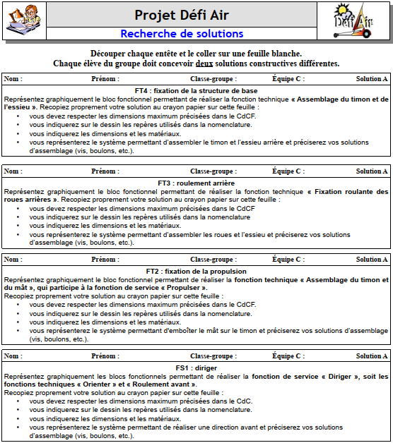 Dans le cadre d'un projet de mini char à voile mené au collège, le “Défi Air”, les élèves ont analysé des chars, décortiqué les blocs fonctionnels pour comprendre comment ils étaient construits. Ils ont les documents 310 et 313, et se répartissent les tâches puis notent cette répartition dans le document 315 :