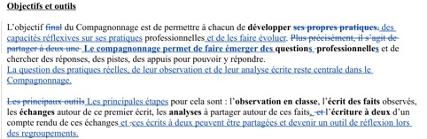 • Un vademecum a été réalisé par les membres du dispositif afin de garantir un cadre éthique et professionnel rassurant. C'est un document Framapad permettant un travail collaboratif qui évolue au fil des échanges comme en témoignent les modifications volontairement conservées dans cet extrait :
