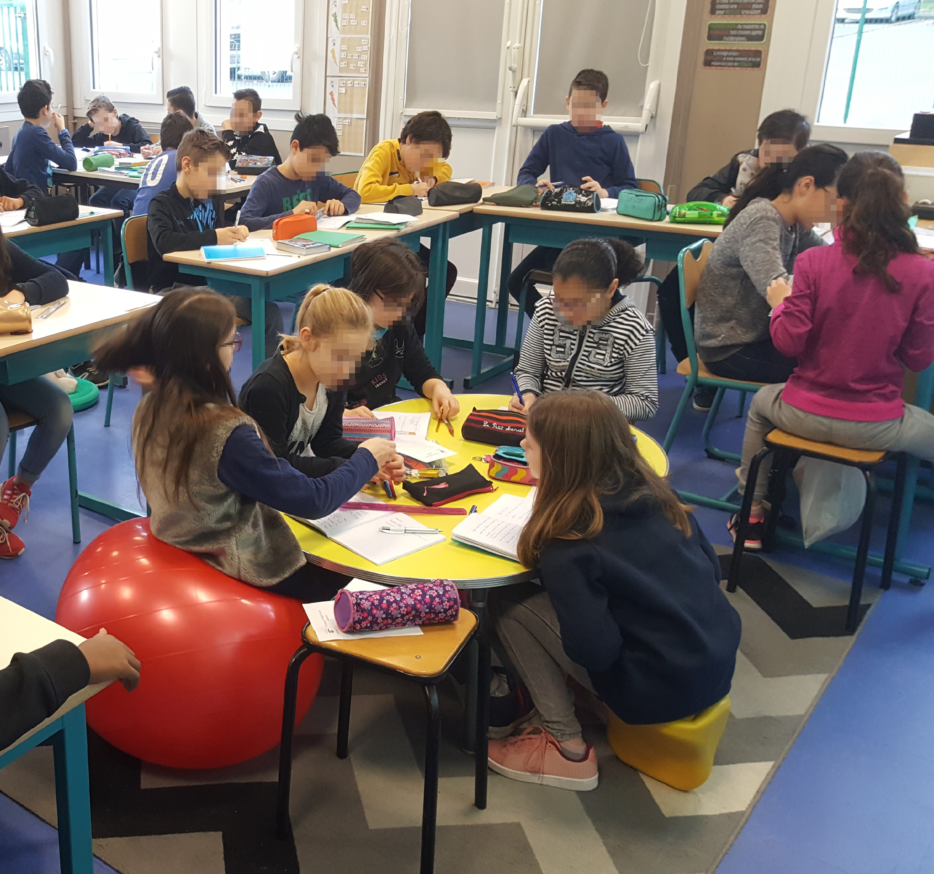Les deux enseignantes qui expérimentent cet aménagement de classe ont fait le constat d’un manque régulier d’attention des élèves avec des effets, certes, sur les résultats scolaires, mais d’abord sur le climat de la classe. Dès la fin de l’année scolaire 2016-2017, Sophie Deroo s’est documentée sur la classe flexible à la recherche d’une autre organisation pédagogique favorisant l’engagement des élèves, prenant davantage en compte leurs besoins, et, plus particulièrement, le besoin de bouger. La classe flexible a d’abord été considérée comme une autre façon d’organiser l’espace de la classe et comme une réponse aux insatisfactions relevées. Il fallait trouver un dispositif différent ou, du moins, que soient réinterrogés le classique aménagement frontal (repenser l’organisation spatiale), la mobilisation intellectuelle de chacun (repenser l’organisation temporelle) et les objets de distraction (repenser la gestion du matériel individuel). Sa collègue Myriam Antoni l’a accompagnée dans ce projet, si bien que l’école a d’emblée impliqué deux classes de fin de cycle 2 et de cycle 3 dans ce dispositif dès la rentrée scolaire de 2017.