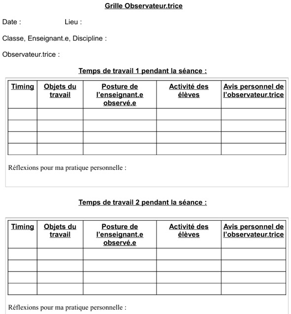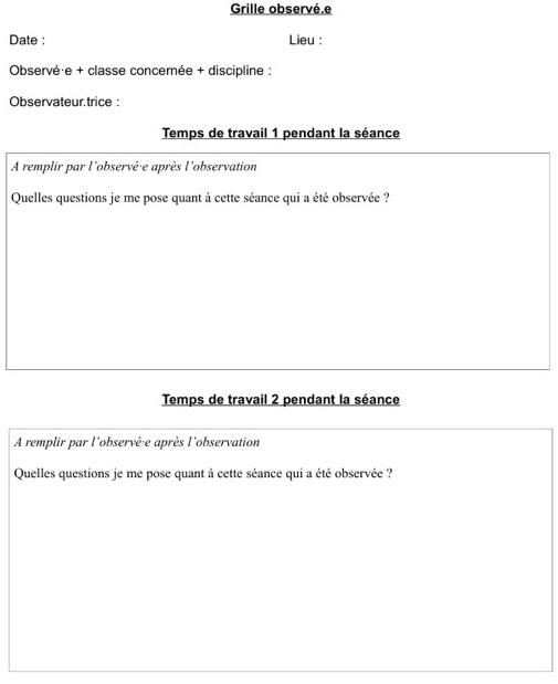 La grille “observé” : L'objectif est d'adopter une posture réflexive quant à ses gestes professionnels permettant d'améliorer la séance. Elle invite l'enseignant à questionner l'activité mise en œuvre.
