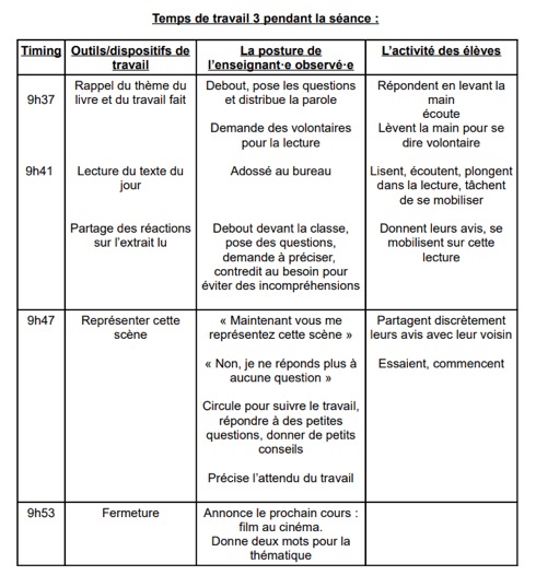 Stéphanie et Julien éprouvent lors de cette séance d'observation, une grille visant à favoriser le compte-rendu factuel. Elle met en lumière le rythme impulsé lors de la séance, les temps d'activité de l'élève et les postures enseignantes.