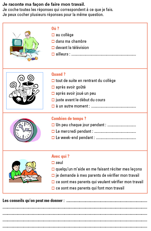 La séquence consacrée à l’organisation du travail personnel commence par un QCM intitulé "Je raconte ma façon de travailler à la maison". À chaque question posée (Où ? Quand ? Comment ? Avec qui ?), l’élève coche une /des réponse(s). Puis il raconte aux autres quelles sont ses conditions de travail.