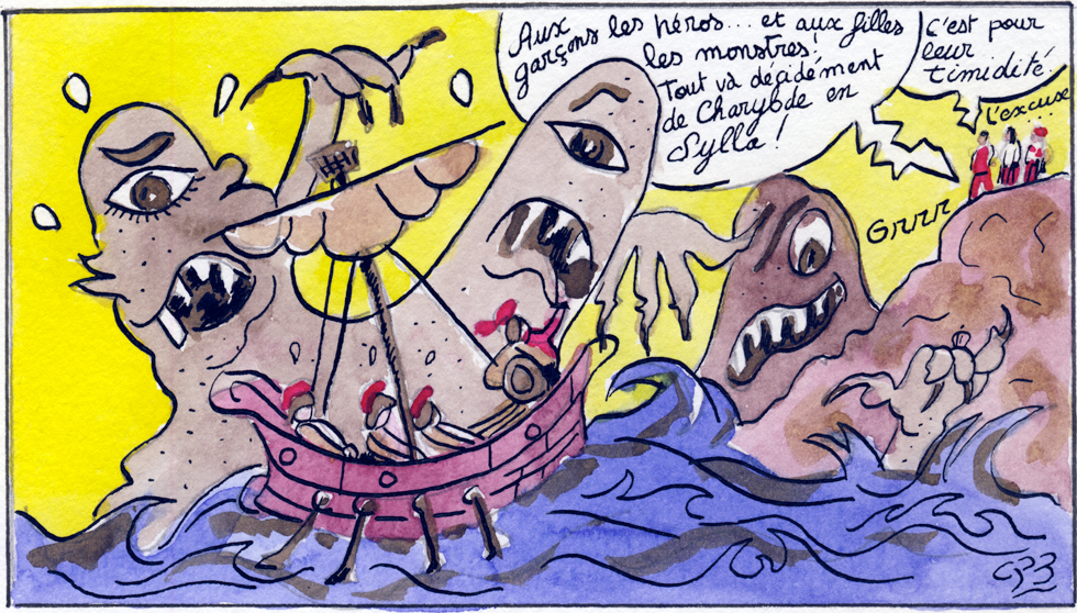 Très vite, les élèves sont invités à monter sur scène : le bateau d'Ulysse s'installe côté cour, les monstres marins côté jardin. Il n'y a guère le temps de s'impatienter derrière le rideau, le professeur tape les trois coups. Les deux groupes se présentent, évoluent sur la scène : l'arrivée du bateau, la rencontre avec le monstre, la capture de quelques compagnons, la détresse d'Ulysse. Dans la séance, plusieurs répétitions ont lieu, enrichies chacune de conseils sur le rythme, l'occupation de l'espace, mais aussi sur l'importance du rôle de chacun. Un seul faillit dans son personnage et c'est tout le groupe qui est en déséquilibre. Chacun porte son rôle dans la saynète. Une fois celle-ci au point, le comédien propose d'amplifier l'aspect sonore afin d'être au plus proche du texte, comme une recréation de celui-ci. "Que disent les marins effrayés ?" Il faut faire entendre leur peur, leur besoin de se protéger. Chacun est invité à trouver ce qu'il peut dire, sans cacophonie, on doit distinguer les quelques paroles, pas seulement des cris d'effroi. Quelques répétitions plus tard, le cours est terminé, la saynète aboutie ; le texte restera dans les esprits. Les élèves auront aussi appris à travailler avec le rideau, à être/à ne plus être dans son rôle, à assumer son personnage pour assurer la réussite du groupe entier, à respecter la place de chacun, à écouter et prendre en compte les conseils : une réelle mise en abyme des qualités relationnelles indispensables au travail en classe.