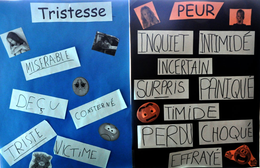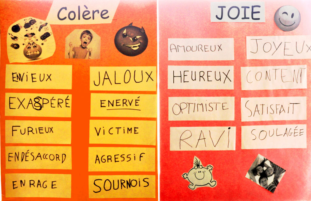 C'est précisément lors de ces séances de réflexions collectives que certains ont soulevé le problème du langage. En effet, au cours de la séance de médiation, les médiateurs demandent aux "médiés" d'exprimer leur ressenti. Or il n'est pas évident de trouver les mots pour exprimer ce qui relève d'un vécu très personnel, de l'émotion ou encore de trouver les mots un peu abstraits pour parler des valeurs en cause. Cette difficulté est d'autant plus grande que les élèves sont jeunes et relèvent parfois du CP. Un apprentissage s'impose donc. Dans chaque classe, on travaille le lexique des émotions, à l'aide du "Comment chat va ?" régulièrement pratiqué en classe. Les réponses étant si réduites, les élèves se sont peu à peu aidés du tableau des "têtes de chats", chacune exprimant une expression particulière illustrant le mot pour la dire (voir annexe). Si le tableau entier exprime trente-six émotions, en maternelle, les élèves commencent par choisir entre les sept "frimousses" affichées : joyeuse, effrayée, inquiète, fâchée, vilaine, étonnée, triste. Mais il faut toujours justifier son choix. "Moi, c'est la vilaine, parce que je préfère rester à la maison" ou "Je suis heureux parce que j'aime bien le travail qu'on fait !". Cet apprentissage est approfondi à l'aide d'albums comme Parfois je me sens... (Anthony Browne, éditions Kaléïdoscope). Chaque année, les médiateurs sélectionnent quelques mots de la liste et les collent sur quatre affiches : peur, colère, joie, tristesse (voir ci-dessous). Ils seront utiles pour aider les plus jeunes à exprimer leurs émotions ou pour leur proposer des reformulations. Lors des rencontres entre établissements, ces tableaux seront des sources d'échanges. Pendant le "parcours citoyen" les mots ne sont pas seulement répartis selon les quatre catégories mentionnées, mais aussi classés dans un ordre progressif du plus faible au plus fort pour chaque émotion. Cet outil, appelé "humeuromètre", permet à chacun d'évaluer son degré d'émotion par le mot qui convient (voir annexe). La connaissance de soi passe par la maîtrise de la langue, on se connaît et on se contrôle d'autant mieux qu'on peut mettre des mots sur ce qu'on ressent. Un autre travail est aussi mené sur le vocabulaire des qualités. Pour apprendre à regarder les camarades avec un œil positif, on demande de dire ce qu'ils ont de bien. Chacun choisit d'abord son camarade puis, dans un second temps... il est tiré au sort ! Les réponses se limitent, au début, à deux mots : joli, gentil. À l'aide d'une fiche (voir annexe), ils enrichissent leur vocabulaire. Pour le maîtriser, ils réalisent, par exemple, des acrostiches sur le nom du camarade à partir de cette liste... Ces divers apprentissages sont d'ailleurs tout l'enjeu de l'axe pédagogique du projet d'école autour de la maîtrise du langage de la petite section de maternelle au CM2.