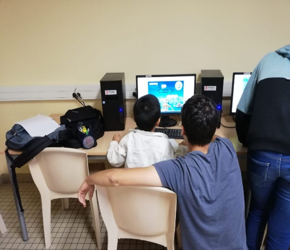 Un élève de troisième accompagne un écolier dans la prise en main du jeu.