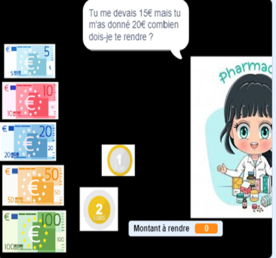 Pour progresser d’une boutique à une autre, le joueur calcule le montant de la monnaie à rendre. Pour cela, il clique sur les billets et les monnaies pour faire afficher le montant exact.