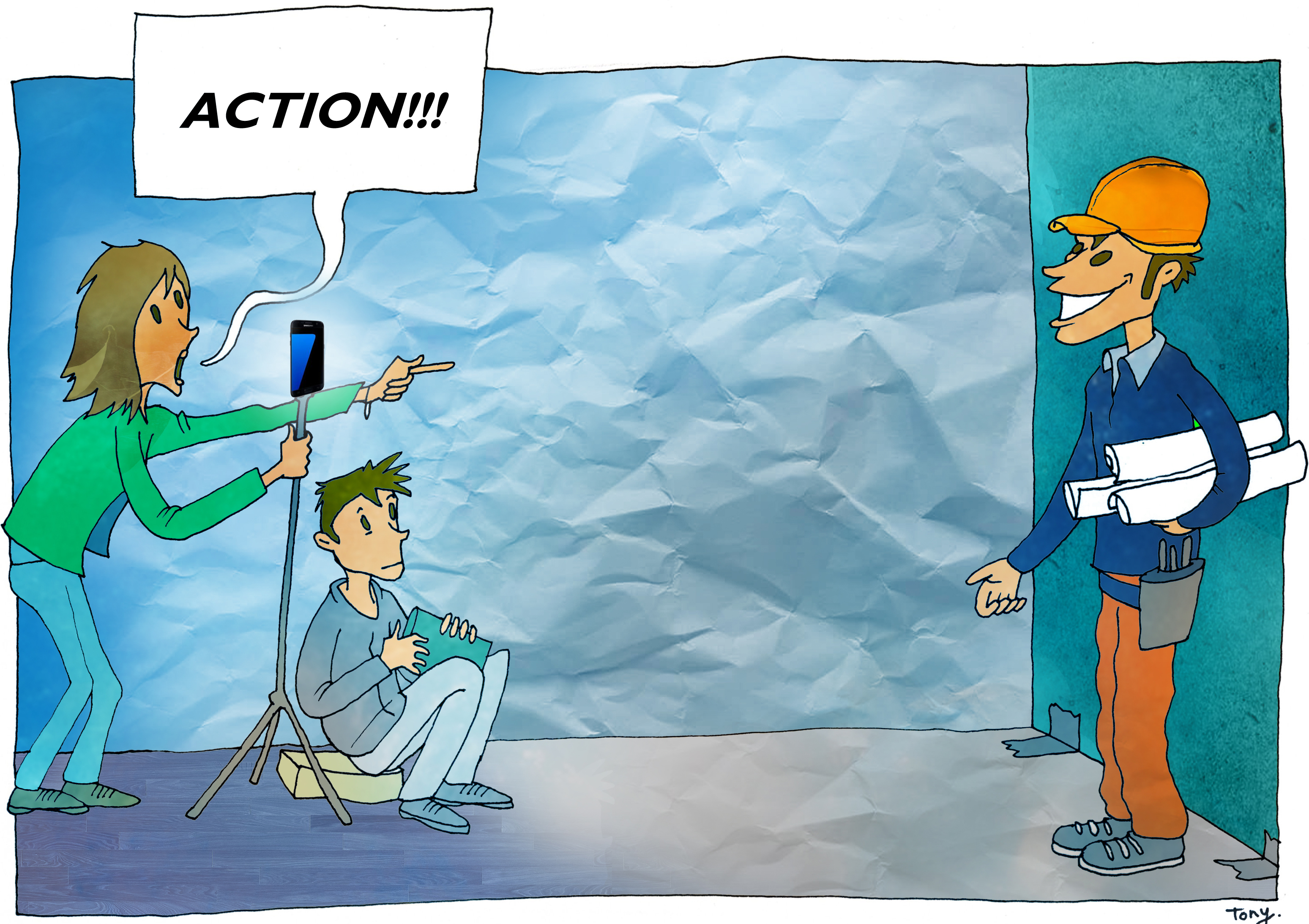 Le thème de travail retenu pour la vidéo de première année est l'autoportrait à travers la fabrication d'un CV vidéo1. L'objectif visé est de permettre aux étudiants, issus de parcours très différents, d'apprendre à se connaître, à valoriser certains aspects de leur personnalité et à les partager avec les autres lors du visionnage. Par cette connaissance mutuelle, les professeurs entendent travailler l'esprit de groupe nécessaire au développement des compétences de coopération qu'impliquent les métiers du bâtiment, collectifs par nature. Ces compétences sont d'ailleurs très importantes pour deux des oraux d'examen de fin de deuxième année. En effet, ils se préparent pendant deux semaines par équipes de trois ou quatre étudiants tirés au sort et débouchent sur une soutenance individuelle pour laquelle chaque candidat doit montrer sa maîtrise du projet d'ensemble et la cohérence de l'équipe. Une fois vaincues les premières réticences à se présenter, les étudiants se sont lancés avec enthousiasme dans ce projet et ont, dans le même mouvement, appris à se connaître et défriché l'univers complexe de l'expression filmique et de ses contraintes techniques. Ils ont eu davantage de facilités à finaliser leurs capsules vidéos puisque le thème de travail n'impose pas de recherches particulières pour enrichir le contenu. L'exercice a en outre l'avantage de mieux préparer les étudiants à la recherche de stage qui demande de se présenter seul face à un employeur. Une forme de progressivité a ainsi été trouvée dans les apprentissages et le projet d'AP est, par conséquent, devenu cohérent sur les deux années de BTS.