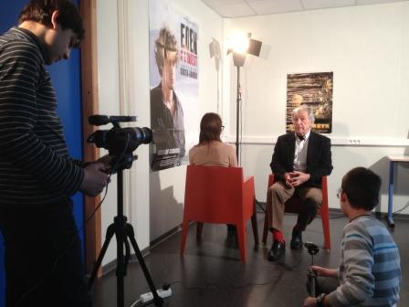 En cinquième, l'axe choisi est le cadrage, la valeur des plans et les mouvements de caméra ; le langage filmique est donc au centre des préoccupations. Cette année, la classe de cinquième va travailler avec Gérard Sergent, chef opérateur. Il s'agira de réaliser un clip vidéo illustrant un titre d'un chanteur de la scène mancelle. Le choix du projet est en corrélation avec l'axe de travail annuel, puisqu'il permettra de se concentrer sur la réalisation sans se soucier du son. Voir à l'œuvre un professionnel du cinéma, travailler avec lui et sous son égide est une source d'apprentissage inestimable pour les élèves comme pour les professeurs. Toute la classe de cinquième sera mobilisée en février. Ensuite, selon la durée du projet, l'équipe envisage de faire un autre clip au troisième trimestre, en autonomie, cette fois. En quatrième, le son et la lumière sont plus précisément travaillés. Le projet annuel portera sur le genre documentaire en collaboration avec le réalisateur Michel Esquirol. Trois courts-métrages vont être produits autour de manifestations qui ont lieu à l'Espal. Le premier sera consacré à l'exposition "Voir l'arbre" présentée de janvier à avril 2013. Ce premier documentaire s'articulera autour d'interviews des artistes, d'images du vernissage et des œuvres exposées. Le second sera consacré à la représentation de la pièce Tartuffe, de Molière, mise en scène par Monique Hervouët. Là aussi, une interview du metteur en scène, des comédiens, des images des répétitions et de la première viendront nourrir le film des élèves. Le troisième documentaire sera consacré aux coulisses de l'Espal, un univers ignoré des collégiens et peut-être même un peu mystérieux. Par ailleurs, le dispositif est parrainé par le cinéaste Costa-Gavras qui est venu récemment rencontrer l'équipe et les élèves. Une journée riche pour les collégiens : ils ont mené une interview du réalisateur tels de vrais professionnels (voir ci-dessous) puis ont reçu les commentaires et conseils du cinéaste sur un des courts-métrages qu'ils ont réalisé. Une leçon de cinéma que ces jeunes ne sont pas près d'oublier.