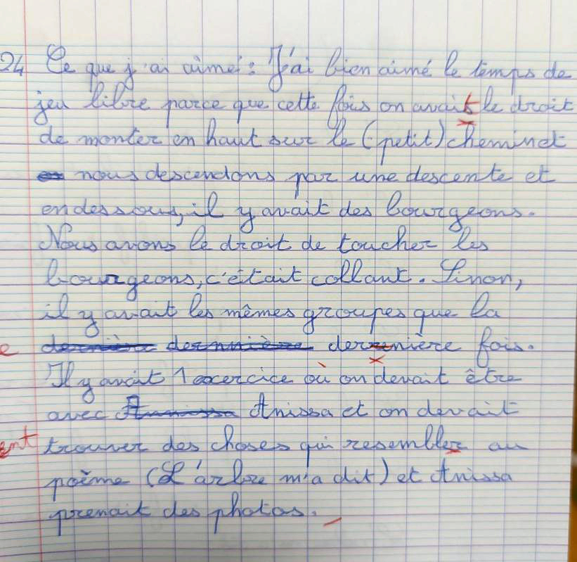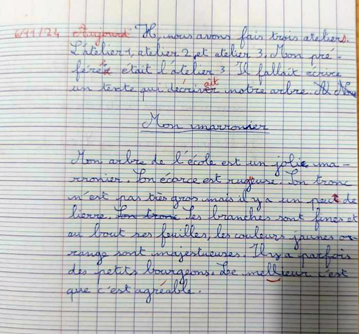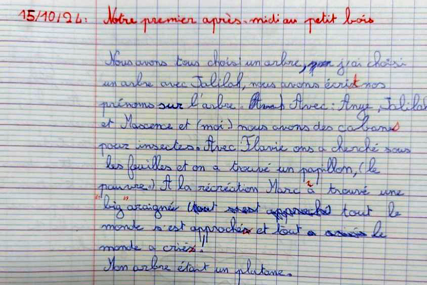 Au fil des semaines, les retours d’expériences s’étoffent et le cas échéant, l’élève retranscrit au propre les textes produits pendant les ateliers d’écriture en pleine nature.