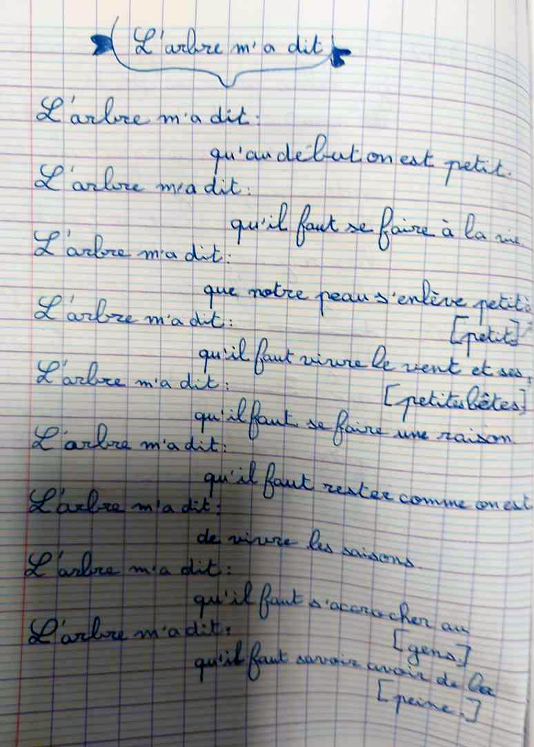 Ici, les élèves devaient réaliser un poème à la manière de Jean-Pierre Siméon, “L’arbre m’a dit” :