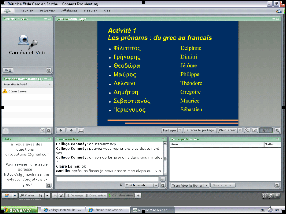 Plus encore que les autres départements de l'académie, la Sarthe connaît de grandes difficultés dans le recrutement d'enseignants de lettres classiques en collège, ce qui y compromet l'enseignement du grec. En effet, si bon nombre de professeurs de lettres modernes, titulaires ou remplaçants, peuvent assurer des cours de latin, ce n'est absolument pas le cas pour le grec. Les effectifs d'hellénistes fondent donc dans les collèges, risquant de tarir à terme le recrutement des lycées sarthois où une offre d'enseignement du grec existe. Comment préserver, valoriser la filière littéraire au lycée dans ce département, en étoffant les options de grec ou les enseignements d'exploration : "Langue et culture de l'Antiquité grecque" là où elle est proposée ? Comment permettre à des collégiens d'explorer une langue ancienne et d'ouvrir ainsi leur champ d'orientation ? Comment tendre à plus d'équité et à une meilleure égalité des chances sur le territoire ? Un dispositif innovant a été mis en place, à l'initiative de Madame Husson, IA-IPR lettres. Depuis septembre2010, l'enseignement en visioconférence du grec ancien existe dans cinq collèges sarthois où cet enseignement n'était pas proposé jusqu'alors. Ces établissements, qui faisaient nécessairement partie de la toute première vague d'implantation de l'ENT, ont été choisis en raison de la présence d'un professeur de lettres classiques, de l'offre d'enseignement dans le lycée du secteur, et enfin, l'adhésion forte des équipes de direction et des enseignants sollicités pour le projet a été déterminante.