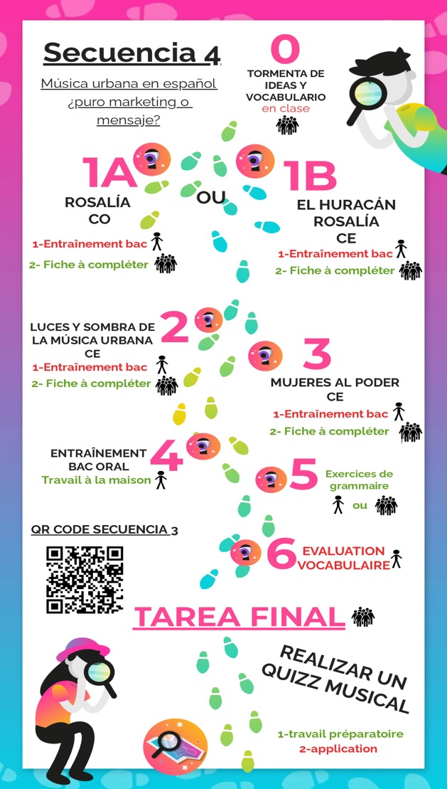 Comme le montre le plan de séquence présenté et consacré à la musique urbaine en espagnol, chaque séquence est construite autour d’une problématique (ici savoir si cette musique est pur marketing ou aussi porteuse de message) et de trois types de compétences à acquérir : grammaticales, culturelles et lexicales, méthodologiques et phonologiques enfin. Dans l’exemple jointe, sont étudiés le passé composé et les pronoms personnels (grammaire), les styles musicaux urbains, le flamenco (culture), le lexique et vocabulaire musical (lexique), l’identification d’une opinion, la structure d’un article ou le repérage d’une situation d’énonciation (méthodologie). Enfin, la séquence se termine par une tâche finale, souvent collective, parfois notée, et qui va permettre de donner sens et motivation à la séquence, et si possible du plaisir dans le travail. Ici, il s’agit de la construction d’un quiz musical qui peut donner lieu à un concours interne à la classe par exemple.