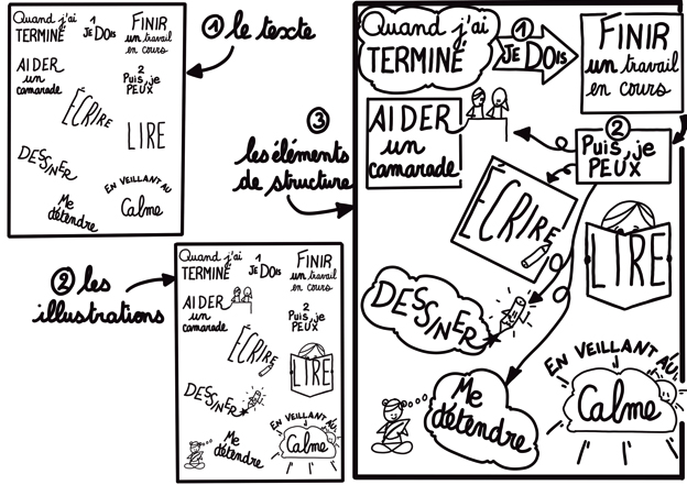 Une fois que l’on s’est entraîné quelque peu au graphisme de base, on peut se lancer en écoutant une émission ou une conférence afin de s’approprier le système de filtrage des informations, de l’organisation de la page. Le sketchnote ne passe pas par l’étape de travail au brouillon, on accueille les idées, on les range, on les met en relation. « On fait sacrément travailler notre cerveau ! » précise l’enseignante.