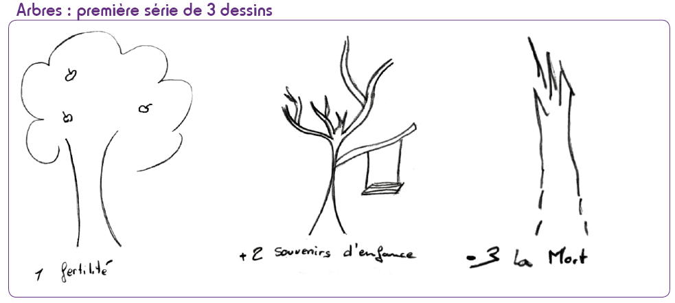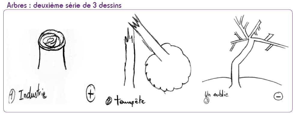 En quoi consiste ce dispositif ? Le protocole est extrêmement précis et en cours d'expérimentation, nous n'en donnerons donc que les grandes lignes en nous appuyant sur un exemple, le cas de Laura. Après une tentative de suicide, en conflit avec sa mère, séparée de son père, elle vit près de chez ses grands-parents et se retrouve en lycée professionnel, ce qu'elle vit très mal, "un truc de cas soss !". Le dispositif est présenté à l'élève en lui précisant que l'entretien a pour but de l'aider à y voir plus clair sur son orientation, ce que l'élève ne comprend pas tout de suite quand on lui demande de dessiner trois arbres ! (voir ci-dessous) "J'ai l'impression de retourner en maternelle !". Après avoir réalisé ces dessins, l'élève doit marquer l'un des arbres du signe positif et un autre du signe négatif (polarisation). Un titre est donné aux arbres sous la forme d'une impression ou d'un sentiment marquant la tonalité affective du dessin, puis l'élève doit raconter, l'une après l'autre, l'histoire des trois arbres comme si c'était eux qui parlaient : "Avant d'habiter la Terre, j'étais au jardin d'Éden, quand soudain, un homme et une femme dévorèrent mes fruits, et c'est comme cela que je me suis retrouvé sur terre pour apporter la fertilité" (Arbre 1 : fertilité). "J'étais dans le jardin d'une vieille dame. La vie y était triste ; pas d'enfants, juste un ou deux moineaux ou son chat... Mais quand elle vint à mourir, une autre famille s'installa. Il y avait des enfants, un chien, un chat, et des oiseaux qui chantaient à longueur de journée ! Même à Noël, j'étais décoré de mille feux : je retrouvais la vie !" (Arbre 2 : souvenir d'enfance). "Par une triste nuit d'été où l'orage éclata, je me fis foudroyer et je mourus." (Arbre 3 : la mort). Cela permet de déplier les trois moments de l'histoire de l'élève (présent, passé, avenir). On demande ensuite à l'élève d'expliciter, à partir d'éléments du dessin (les racines, les branches...), des sensations, des actions permettant de satisfaire les besoins exprimés par les arbres polarisés. On amène, petit à petit, à formuler deux avenirs possibles et opposés. Cette procédure de base met en évidence ce qui attire le jeune et ce qui le repousse. À la suite, il s'agit d'évoquer comment il relie ces deux extrêmes afin d'établir un inventaire de la situation actuelle.