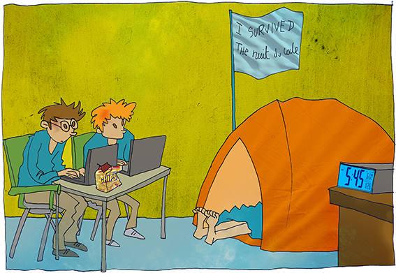 La rencontre se déroule réellement sur 24 h, de 17 h le jeudi à 17 h le vendredi. Durant ces 24 h les élèves s’organisent en interne pour travailler deux projets avec quelques contraintes formelles. Des temps de repas (20 h-22 h/13 h-14 h), de toilettes (22 h-23 h), de repos obligatoire (5 h en continu entre minuit et 7 h du matin) sont planifiés pour permettre une régulation et fournir un cadre sanitaire et éducatif aux élèves. Le soir les élèves ont ramené de quoi préparer leur repas ; certains ont des pique-niques, d’autres se sont organisés pour un repas plus festif, d’où par exemple le fait qu’un groupe ait obtenu un bonus “raclette réussie”. Les élèves dorment dans les salles de cours et le CDI (il n’y a pas d‘internat), il leur est demandé d’amener un matelas pneumatique et un duvet. Quelques règles sécuritaires complètent le dispositif, comme l’interdiction de sortir de l’établissement et de conduire pour rentrer chez soi le lendemain.