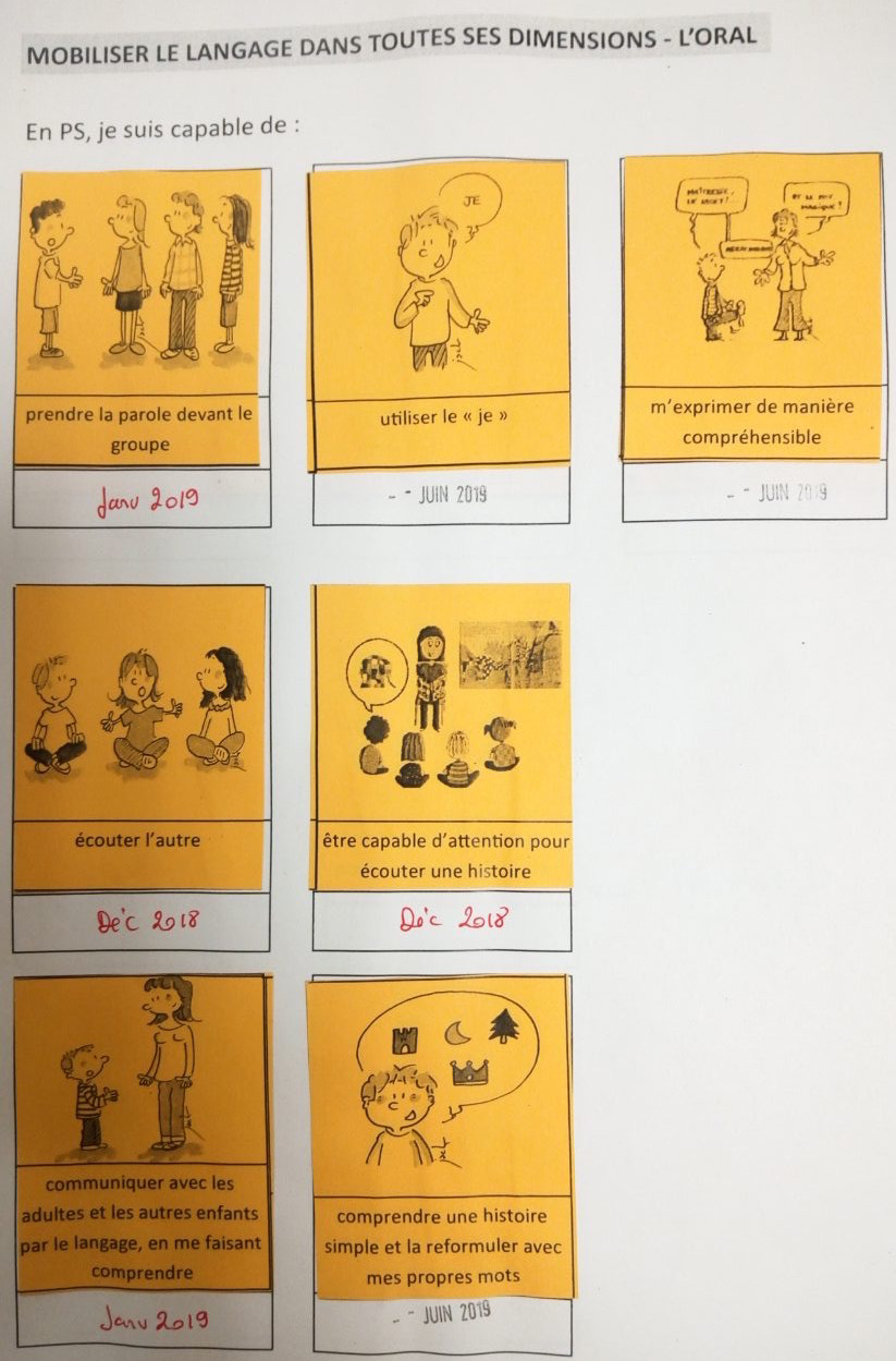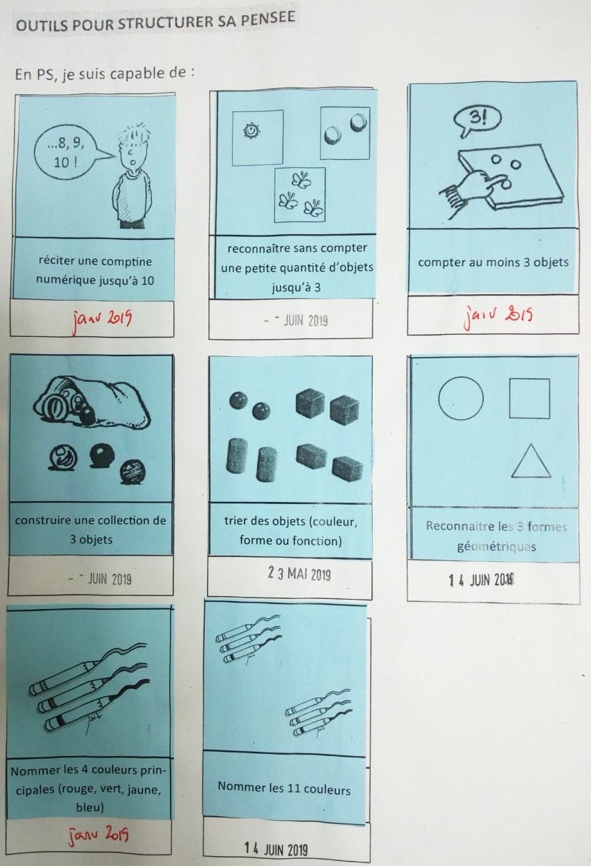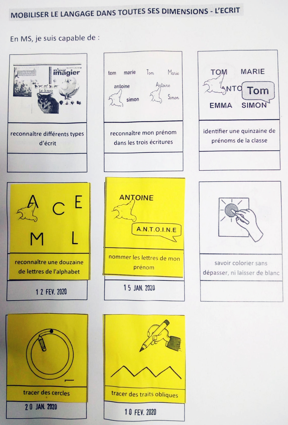 À l’école maternelle Jean Macé, le carnet de suivi des apprentissage réunit les cinq domaines d’apprentissage. Pour faciliter la lecture des enfants, un domaine d’apprentissage équivaut à une couleur.