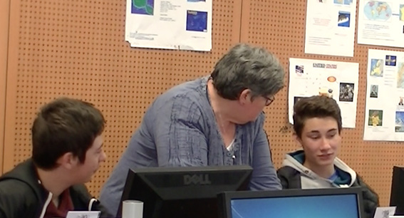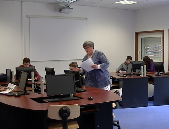 Debout, au dessus des élèves. Réponse collective à des besoins d'élèves. Temps assez courts passés avec chaque élève.