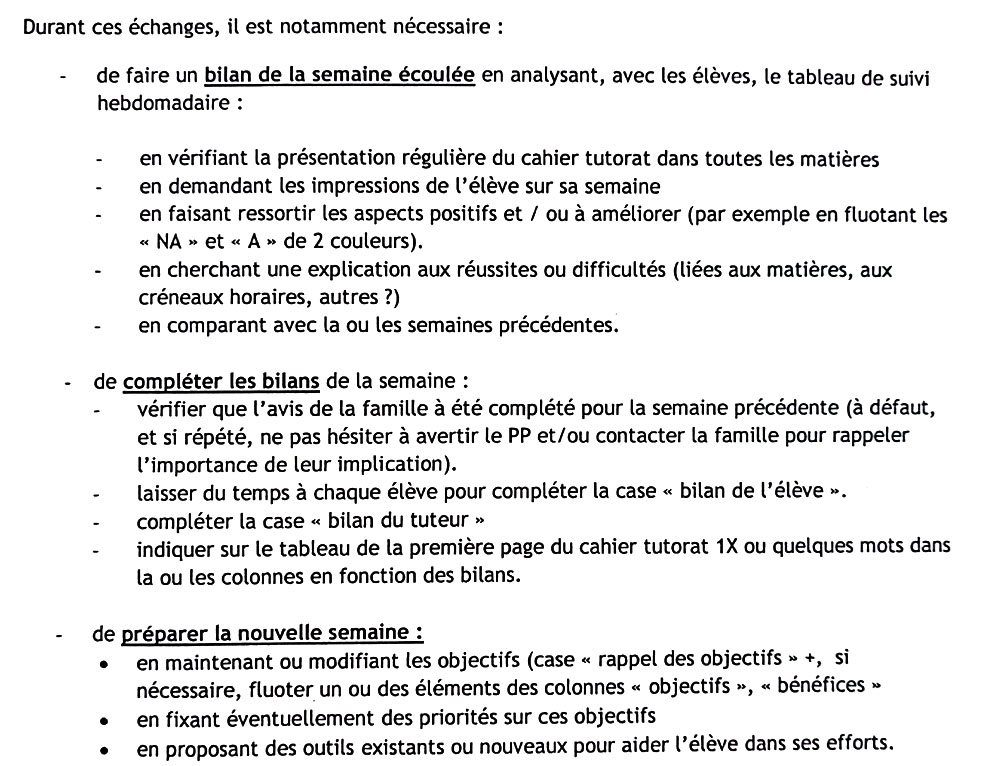 Phase 3 : Les élèves présentent leur bilan et bénéficient alors du regard des pairs qui donneront un avis sur la semaine de leur camarade. Phase 4 : Le tuteur rédige les bilans individuels et discute des objectifs de la semaine suivante. C'est la fin de la séance, on rappelle l'importance de se serrer les coudes pendant cette période, on encourage.