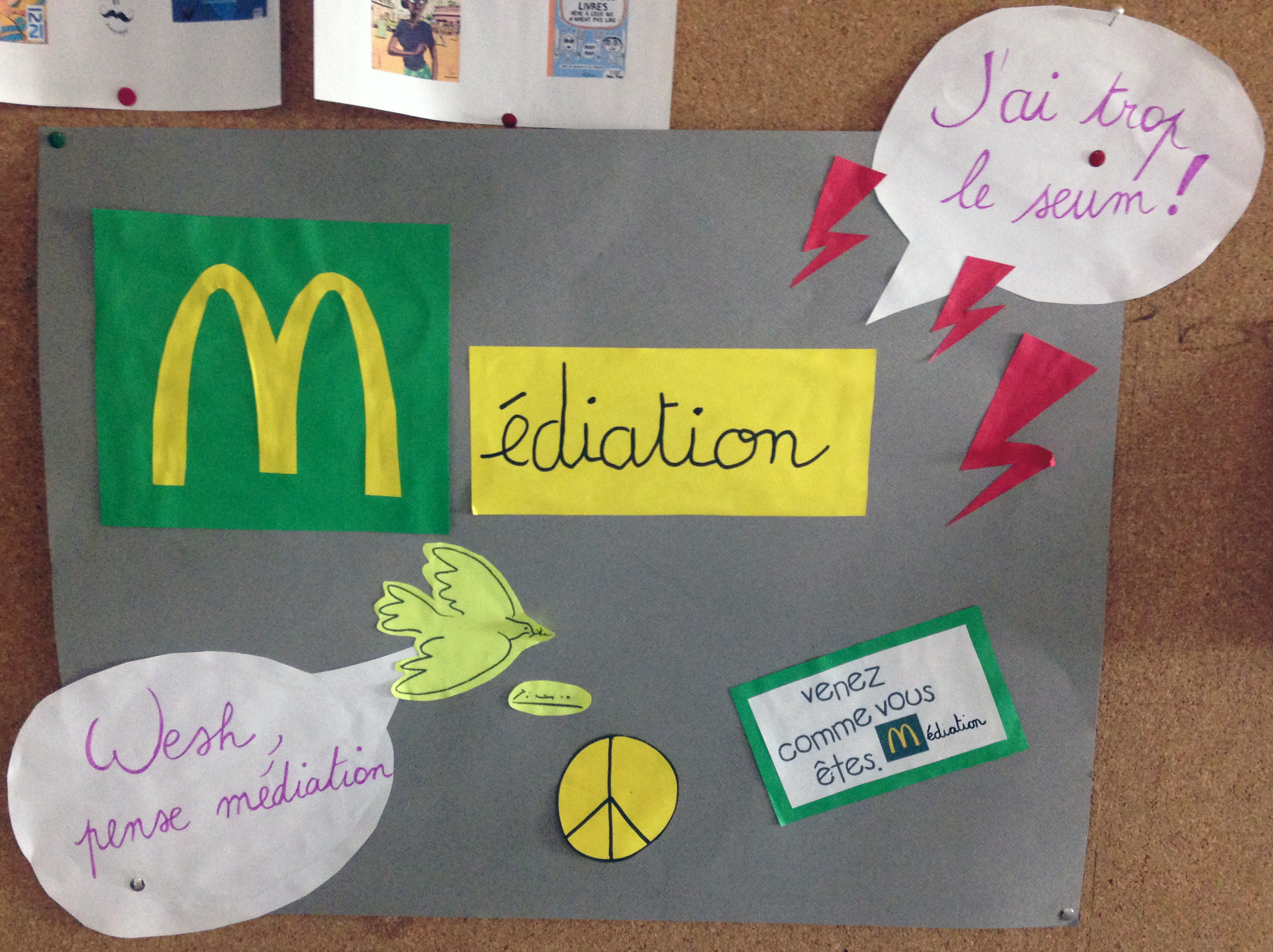 Imaginer et concevoir une sensibilisation courte, dynamique et relayée par des affiches dans l'établissement pour l'information sur la médiation et le recrutement des médiateurs élèves. |