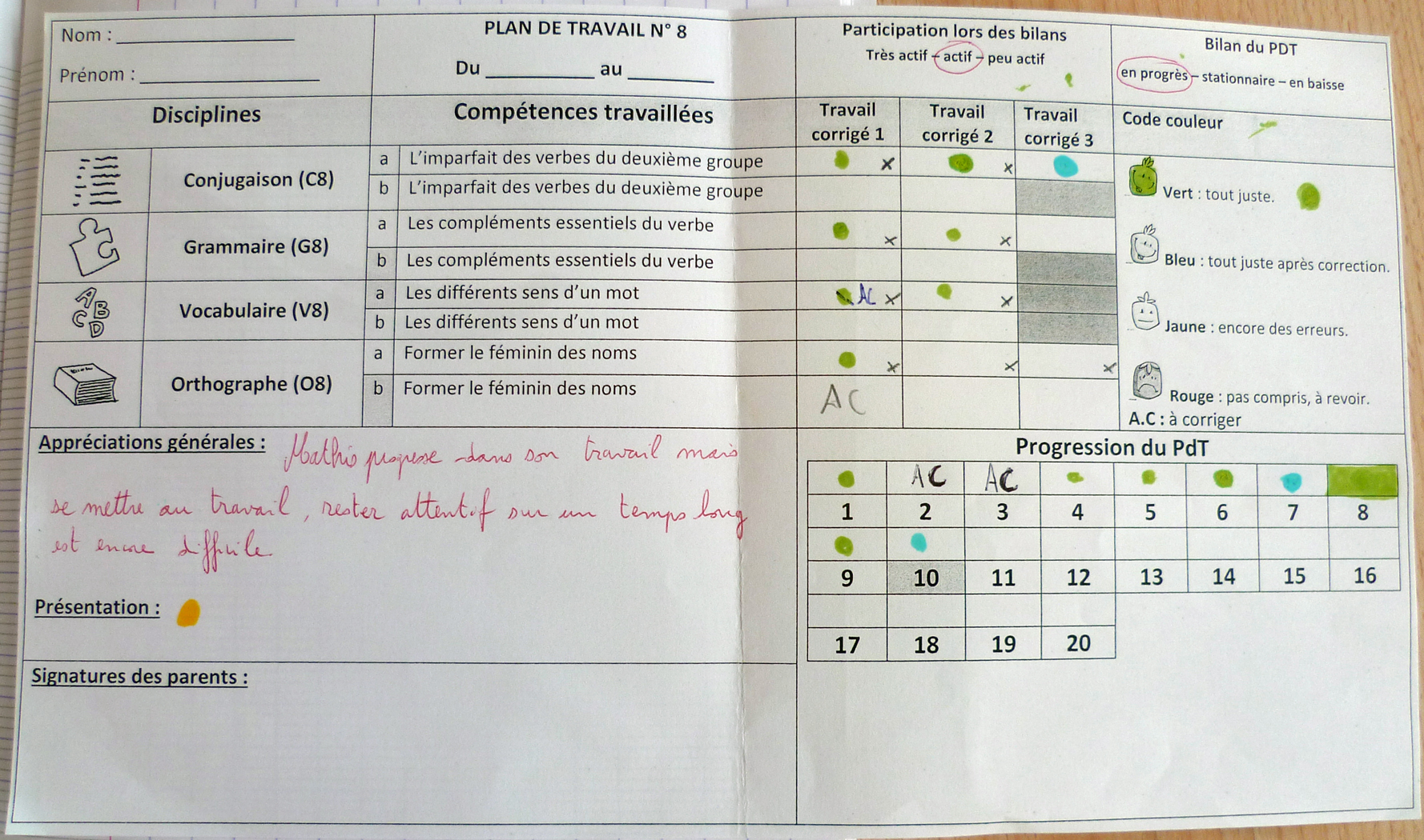 En élémentaire, les résultats sont proposés sous une autre forme : un code-couleur permet aux élèves de garder une trace de leur cheminement : vert si tout est réussi, bleu si tout est juste après correction, jaune s’il reste des erreurs, rouge si la procédure est incomprise. Le code AC inscrit par l’enseignant indique aux élèves que l’exercice est à corriger, sans que soient identifiées les erreurs. Ce regard positif porté sur l’investissement et le travail de l’élève apparaît explicitement sur les bilans.