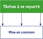 4. Chaque élève fait la même nature de tâche, à nouveau pour permettre un apprentissage par chacun, par exemple, chacun conçoit et dessine une solution pour assurer chaque fonction technique du projet de char à voile radiocommandé. On est dans une démarche comportant bien plus d'aller-retours entre les élèves, car chaque partie est immédiatement liée à une autre. La mise en commun n'attend pas le produit final mais doit se faire à intervalles réguliers. Le projet progresse et les élèves aussi dans une répartition en losange. Cette stratégie repose ainsi sur le schéma suivant : Des tâches sont à répartir au sein du groupe, une fois la répartition faite, chacun réalise sa tâche individuelle. On passe alors à la mise en commun qui sera l'occasion d'une nouvelle répartition des tâches restantes au sein du groupe. Cette nouvelle répartition faite, chacun réalise sa tâche individuelle avant de procéder à une nouvelle phase de mise en commun.
