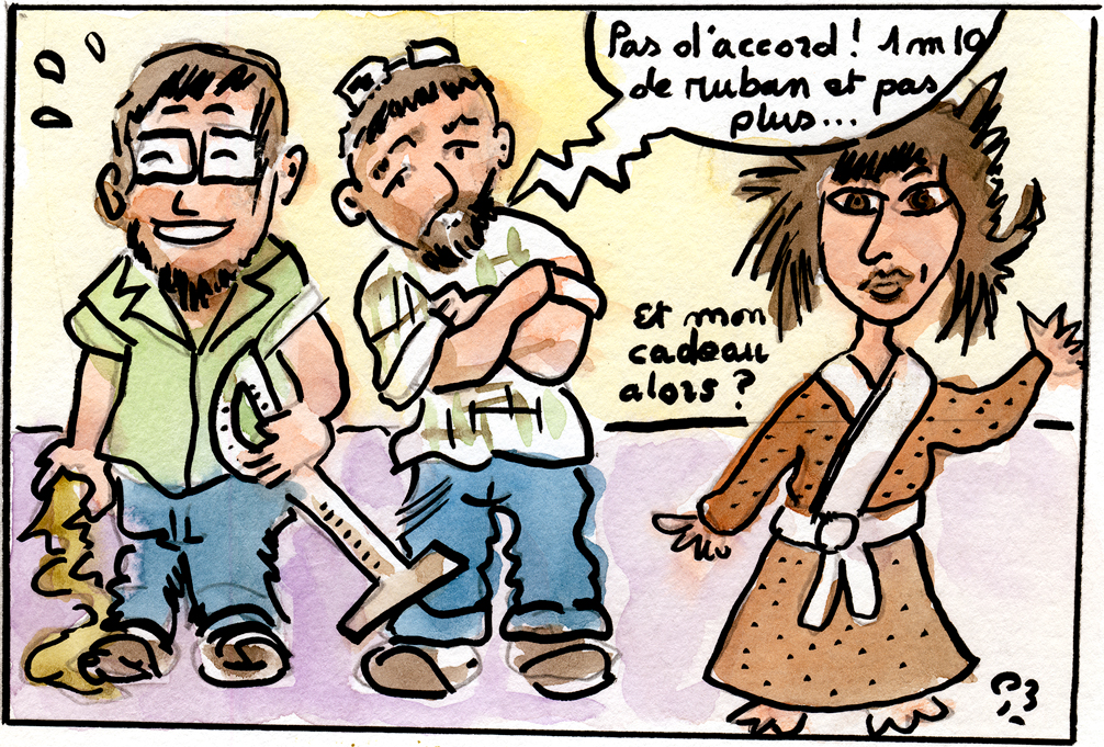 N. Bricard a cours ce jeudi-là de 13 h à 14 h Comme toutes les trois semaines, les élèves de quatrième savent qu'ils vont avoir à résoudre un problème DUDU. Les collégiens ont l'habitude, ils sortent un stylo et un cahier ou une feuille. C'est la dernière production des frères Durand qui est vidéo-projetée à deux reprises. Le contexte de Noël et des fêtes est l'occasion d'exposer un nouveau problème mathématique, dans un emballage humoristique : Arnaud et Julien ont fait un paquet cadeau d'un cadeau dont on ignore la nature. Il ne manque plus qu'à entourer le colis d'un ruban. Une chamaillerie éclate entre les deux frères à propos de la longueur du ruban à utiliser : pour l'un, un mètre suffit, pour l'autre, ce sera insuffisant. Arnaud claque la porte. La question rituelle clôt le film : "Qu'en pensez-vous ?". Pendant la diffusion, la plupart des élèves relèvent les indications qui leur sont données : longueur, largeur et hauteur de la boîte. Aussitôt la projection terminée, c'est l'effervescence : les groupes se forment sans tarder, en fonction des affinités ; des groupes de trois ou quatre personnes. Les discussions s'engagent, des contradictions apparaissent. Certains groupes ont besoin d'explications supplémentaires, d'autres sont autonomes. N. Bricard se met en retrait. Elle n'intervient qu'à la demande des groupes, tantôt pour une aide ponctuelle, tantôt pour relancer la vidéo. Pour résoudre l'énigme, les élèves ont besoin de l'outil du théorème de Pythagore sur lequel ils sont en train de travailler dans la séquence de cours. C'est à eux d'y penser. La vidéo ne suggère rien. La résolution du problème n'est pas tout, il ne s'agit pas d'un exercice d'application, il faut aussi mobiliser les connaissances appropriées : on sollicite bien la prise d'initiative chez les élèves, l'une des caractéristiques d'une tâche complexe. Les élèves ne pensent pas tout de suite au théorème mathématique. Ils ont besoin de visualiser l'objet. Une maquette à échelle réduite est créée, un trait figurant le ruban. Mis à plat, les différents éléments sont ensuite assemblés en solide pour que le paquet retrouve sa forme originale. La reconstruction de l'objet, le passage par le concret constituent un déclic : le théorème de Pythagore est bien l'outil dont on aura besoin pour donner raison à Arnaud. Toutefois, les résultats divergent : Capucine, Claire, Audrey et Chloé pensent qu'il faut 1,17 mètre de ruban. Adrien, Camilo, Axel et Basile, 1,20 mètre. Qui a raison et qui a tort ? Le suspense durera jusqu'à la remise de la production finale.