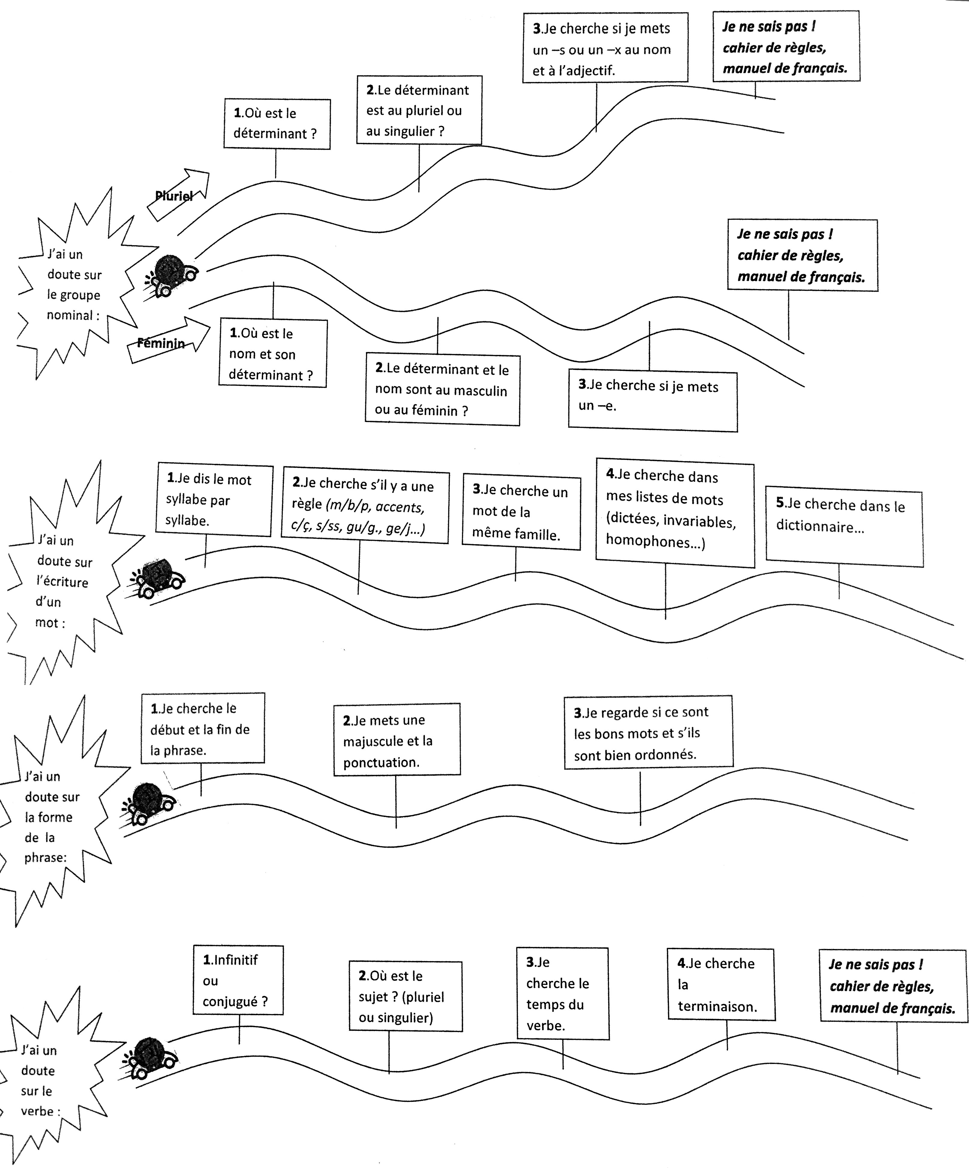 Le travail sur l’orthographe impose d’abord un discours rassurant de l’enseignant, puis une phase d’appropriation prenant appui sur une présentation explicite des quatre chemins orthographiques. À partir d’exemples concrets, les élèves découvrent puis se familiarisent avec ces chemins. Les élèves ont à leur disposition deux fiches : le tableau des quatre passages (c’est-à-dire tout ce qui est à vérifier) et les chemins orthographiques.