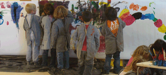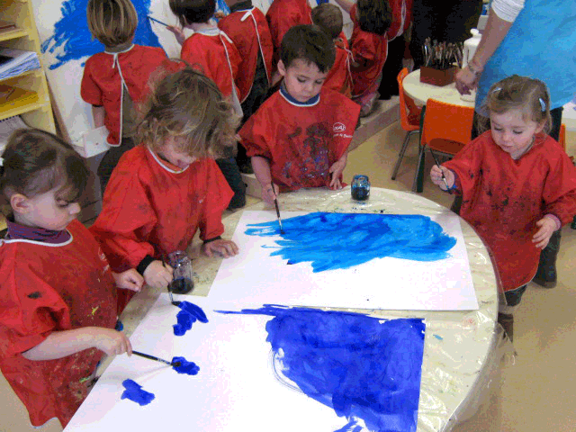 Tout le projet se construit sur l'échange, le partage, la construction collective, en grand ou petits groupes. C'est tout un apprentissage qui dépasse bien largement les arts plastiques que d'accepter de remplir à plusieurs une feuille, de décider ensemble du bleu (le I, le II ou le III de Miró 5 ?), de construire collectivement une sculpture et donc d'accepter une autre proposition que la sienne... Chez les plus petits, les productions sont essentiellement collectives. Chez les plus grands, cette dimension est complétée par des activités de réalisations en petits groupes. Toutes impliquent la mise en mots, le débat, la négociation ; et aussi le renoncement au profit du projet commun. Ainsi, lorsque les petits ont travaillé sur les bleus de Miró et qu'il a fallu réaliser le fond entièrement bleu d'une grande feuille, ils ont commencé par se jeter dessus, en opérant chacun dans son coin.