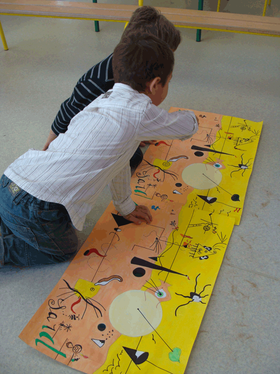 L'affaire se poursuit sur plusieurs séances de "cours théoriques" sur Miró, évidemment adaptés à l'âge du public. Différentes reproductions sont présentées aux élèves, des photographies du peintre à des âges divers, mais aussi certains de ses dessins d'enfant. Il est important qu'ils comprennent que l'œuvre est le fruit d'un homme qui a été un enfant, comme eux. D'autres activités complètent cette découverte : des puzzles qui permettent de reconstruire une œuvre, le jeu des différences (deux représentations de la même toile, l'une dans laquelle des différences avec l'original ont été introduites), exercices de mise en couleurs, de reproduction de certains signes et symboles, tout est bon pour s'approprier l'œuvre du Catalan tout en développant des compétences scolaires du socle commun. L'acuité du regard se construit par la verbalisation, l'échange entre pairs, la pratique artistique, la graphie, la spatialisation... et vice versa ; la richesse de la palette expressive se développe par une meilleure capacité à percevoir. Les enfants prennent ainsi progressivement conscience de l'unité de l'œuvre : la gamme des couleurs utilisée, les symboles présents, la "manière" de représenter... C'est également dans le dialogue en actes avec l'artiste que les enfants mesurent peu à peu ce qu'est la création. Ils doivent par exemple donner des ordres à Margot qui reproduit, sous leur dictée, une toile de Miró : quelle couleur, quelle forme, où... Puis c'est à leur tour de se mettre aux pinceaux. Un mini-concours est même organisé. Une semaine après avoir observé un tableau, les enfants le reproduisent de mémoire sur une grande feuille.