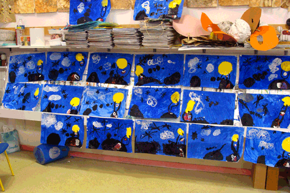 Pour ce qui est des arts plastiques, les enfants s'approprient peu à peu le matériau et le geste (on caresse la feuille avec le pinceau, on ne l'écrase pas violemment). Ils appréhendent l'espace d'une manière plus globale, quand il s'agit par exemple de coller sur le fond bleu les douze petits cailloux noirs, découpés dans du papier, à la manière de Miró. Le fait de travailler avec une artiste professionnelle élargit également la perception des enfants. À plusieurs reprises, Margot peint devant eux. C'est rare, et riche, de voir un artiste en train de travailler. Une manière de montrer que l'œuvre ne naît pas d'un coup de baguette magique. La création est un travail, qui prend du temps, qui demande parfois des reprises, qui se construit lentement dans un perpétuel échange entre l'artiste et ce qu'il est en train de réaliser. Tout cela est incontestablement formateur sur tous les plans, puisque c'est aussi comme cela que l'on progresse à l'école et dans la vie. De la même manière, les enfants travaillent parfois sur une technique et sont amenés à ne pas garder l'objet confectionné. Ils construisent par exemple un pot en terre pour apprendre la technique, objet qu'ils détruiront ensuite. Qu'on soit écolier, amateur ou professionnel, il faut apprendre à choisir, à refaire, à donner à chaque chose la place qui lui convient. Toute réalisation n'est pas géniale ! Et vingt fois sur le métier remettre son ouvrage est une leçon de vie bien autant que d'art. Avec la terre, à la suite de Dali et de ses montres molles, les enfants travaillent autour du mou et du dur, qu'il faut d'abord définir en classant les objets connus en deux catégories. Puis ils transforment le mou en dur en fabriquant avec de l'argile des objets normalement mous, et vice versa. On peut ainsi représenter des objets normalement durs en leur donnant l'apparence du mou grâce à un matériau qui va durcir ! Ils utilisent également de la colle à papier peint dans laquelle ils trempent des vêtements qui durcissent au séchage. Les voies de la créativité sont inépuisables et amènent à regarder la "réalité" de manière à la fois plus précise et différente.