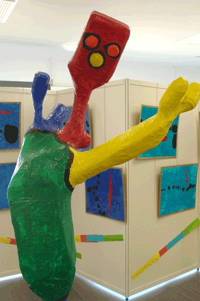 Le projet ne se limite pas aux œuvres à deux dimensions. Chez les MS-GS, le passage à trois dimensions a été initié par la réalisation du "Lapin poisson" (au premier plan du Paysage catalan) de Miró. L'animal hybride a été construit, en carton et fil de fer, d'après sa représentation en deux dimensions. On s'attaque ensuite à plus monumental, à partir de cinq structures, chacune composée d'une branche plantée dans un seau de ciment. La première étape consiste à observer cette ossature. Chacun dit ce qu'il voit (ils personnifient toujours : cette branche est un bras, une tête...) puis propose d'ajouter un élément en lien avec cette interprétation, un chapeau sur la tête, par exemple. Les enfants le fabriquent en papier mâché, puis le fixent sur le squelette et le peignent. Une sculpture composite prend ainsi naissance. Les petits, avec le même principe, réalisent deux sculptures collectives.