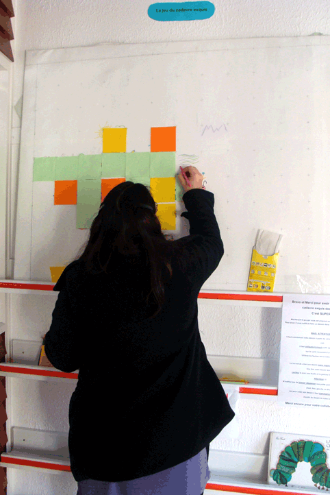 On l'aura compris, le langage est au cœur de tout, y compris le langage écrit. La dimension littéraire du surréalisme n'est pas laissée de côté ; une occasion d'explorer, de renforcer et d'évaluer le langage de manière inédite tout en poursuivant l'imprégnation dans le grand bain du surréalisme. Chez les grands, tous les mots issus de l'analyse des œuvres sont listés par les enfants, puis écrits sur des papiers de couleurs différentes (jaune, bleu et vert) correspondant aux différentes catégories grammaticales. Le hasard permet de constituer des phrases en tirant un mot de chaque catégorie. Les cadavres exquis constituent le support des échanges et des apprentissages langagiers, dans un réseau artistique qui se construit au jour le jour. Une classe fait un dessin, qu'on masque en laissant dépasser un morceau, qu'on transmet ensuite à une autre classe qui va poursuivre le jeu. Et ainsi de suite. C'est difficile à réaliser, constatent les enseignants. Souvent les enfants ne partent pas de l'indice donné, mais réalisent leur propre dessin, sans lien avec le morceau qui dépasse, puis recollent artificiellement le tout. De la même manière, quand ils découvrent le résultat final, ils sont plus intéressés par le repérage de leur propre trace que par la production d'ensemble. Question de soi et de l'autre, d'autocentration et de décentration, une fois encore.