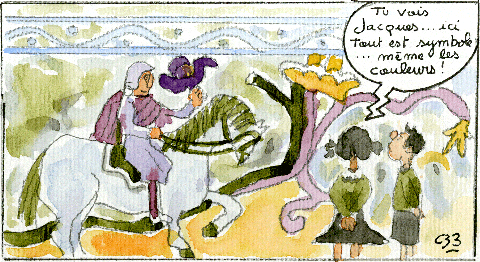 En histoire, Élisabeth Poisson se propose de mettre particulièrement l'accent sur la charge symbolique de ces peintures murales. Plusieurs scènes représentent la lutte entre le bien et le mal : saint Vigor contre Bertulf, incarnation de la cupidité, ou saint Vigor triomphant du dragon, symbole du mal. D'autres évoquent les moyens d'obtenir le salut : prédication de saint Vigor, baptême, scène de résurrection des morts présidée par un Christ en gloire. En réponse à la problématique posée, il s'agira de faire découvrir aux élèves que ces fresques démontrent que le christianisme est bien une religion du salut. Sous la responsabilité du professeur d'arts plastiques, Petra Doittée-Platzer, la symbolique des couleurs, des attributs, sera étudiée, ainsi que la gestuelle des personnages représentés (voir annexe). En français, plusieurs scénarii pédagogiques sont possibles. Par exemple, s'appuyer sur le texte racontant la vie de saint Vigor pour faire relever aux élèves les extraits dans les textes qui permettront de construire les dialogues entre les personnages des peintures murales. L'objectif est d'écrire les bulles correspondant aux différentes images sélectionnées. Ou bien, s'appuyer sur la scène de la chasse au dragon pour étudier les étapes d'un récit, et écrire un autre récit extraordinaire, situé au Moyen Âge, en respectant les étapes repérées en cours. En arts plastiques, les pistes sont nombreuses, aussi : travail sur la fonction narrative des fresques (le côté bande dessinée), sur l'archétype et ses déclinaisons (le dragon), sur la question de la technique de couverture d'une surface... En ce moment, dans le collège où travaille Élisabeth Poisson (collège Volney de Craon), l'heure est à l'organisation du déplacement des élèves vers l'œuvre, car, contrairement au site de Jublains, il n'y a pas pour Neau de prise en charge du transport... Or, pour ce projet, pas question de se passer d'un contact direct avec l'œuvre. L'équipe est aussi confrontée aux questions d'organisation du travail des élèves sur plusieurs années et dans plusieurs disciplines. Pour l'instant, c'est une gommette rouge placée en face des contenus, dans le cahier ou le classeur, qui signalise, dans chaque matière concernée, l'approche "histoire des arts"...