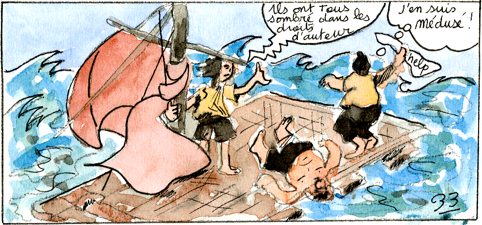 La démarche adoptée dans ces exemples, plus centrée sur les arts visuels, peut se compléter par une approche pluridisciplinaire. Un stagiaire a par exemple exploité la séquence sur Le tricheur à l'as de carreau dans une perspective différente, en mettant l'accent sur la narration dans la mesure où l'œuvre est aussi une dramaturgie. Un tableau, et particulièrement celui-là, raconte une histoire qu'on peut mettre en mots, oralement et par écrit. En guise d'application et de prolongement, les élèves ont ensuite imaginé puis réalisé une photographie qui devait à elle seule raconter une histoire. De l'histoire à l'Histoire, le lien que constitue l'œuvre d'art est évident. La comparaison peut éclairer un personnage historique, si l'on confronte par un exemple le Bonaparte franchissant le Grand Saint-bernard4 et le Napoléon premier sur le trône impérial5. L'analyse des images offre des hypothèses que l'histoire confirmera ou non, et l'histoire apportera des compléments aux images. Dans ce va-et-vient, c'est le parcours historique d'un homme et d'un règne qui se dessine au final, tandis que s'affine la capacité à analyser et comprendre les œuvres artistiques. Et puis, acquérir une culture, c'est aussi comprendre que tout se tient. L'observation d'une esquisse préparatoire a déjà fait comprendre aux enfants vers quoi se tendent les naufragés sur leur radeau (le bateau y apparaît bien plus nettement). Quelle n'est pas leur surprise lorsque leur maître leur montre une vignette d'Astérix 6 parodiant la célèbre toile ! Le commentaire du chef des malheureux pirates : "Je suis médusé !" prend alors tout son sens...