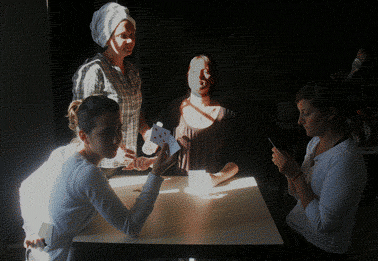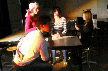 Comment ? Tout simplement en refaisant le tableau avec un appareil photo numérique. Par groupes de cinq (quatre feront les personnages tandis que le cinquième prendra le cliché), les enfants refont le tableau de mémoire, avec les moyens du bord. Il ne s'agit pas de faire une œuvre plastique, mais d'éduquer le regard, et donc ici de restituer le plus exactement ce qu'on a vu, par la réalisation d'un tableau vivant. Chaque petit groupe fonctionne en autonomie pour faire sa photo, pendant que les autres travaillent à d'autres activités. Certains ont déjà le souci de la lumière, utilisant celle des fenêtres, ou carrément celle du rétroprojecteur dont ils détournent l'usage pour l'occasion. D'autres n'y pensent pas. Certains soignent les costumes : ils métamorphosent leur écharpe en turban, ou prennent un gros pinceau pour en faire une plume de chapeau. Tout le monde ne place pas la caméra au même endroit... Puis on se retrouve tous ensemble autour des clichés avec, pour maître-étalon, la reproduction du tableau. Avant toute chose, mettons-nous d'accord : les critères de réussite sont collectivement définis. Après avoir mis la main à la pâte, les élèves ont le regard plus aiguisé. Avec leurs mots, ils nomment des critères précis : le cadrage, le point de vue, la lumière, le placement des personnages, leurs regards... La comparaison des différents clichés est éloquente (voir ci-dessous) et ramène invariablement à l'œuvre originale, observée et analysée d'un regard nettement plus précis. Finalement, on comprend que les premières impressions affectives ne naissent pas "par hasard", mais sont en partie liées à une image dont le sens est savamment construit par l'artiste.