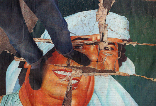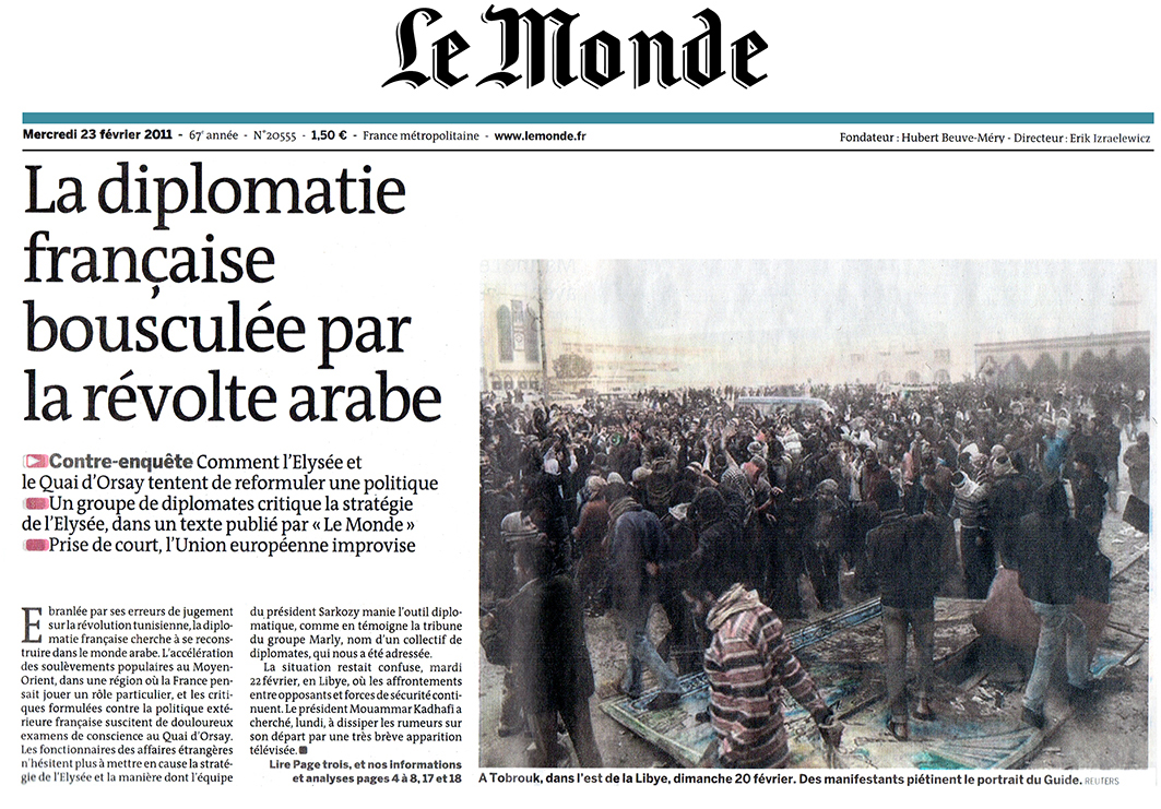 Mais pour autant toute image est-elle porteuse de vérité ? Parallèlement au travail du professeur d'histoire qui s'est penché sur les images d'actualité, d'autant plus qu'en ce printemps arabe 2011, celle-ci était brûlante, il s'agit de formuler une problématique sur laquelle on puisse travailler en commun : Peut-on mettre l'histoire en images sans la trahir ? Les élèves sont confrontés à deux Unes de quotidien. On leur demande d'imaginer qu'ils sont directeur artistique dans le comité de rédaction d'un journal et qu'ils doivent justifier le choix de l'une ou l'autre. Cet exercice d'argumentation est ainsi lié à une mise en situation créative. En première page du Monde du 23/02/2011, on voit une foule d'hommes sur une place (voir ci-dessous). Certains piétinent un panneau d'affichage à terre dont il est difficile de dire, à partir de l'image, ce qu'il représente. La Une du International Herald Tribune datée du lendemain montre en plongée les jambes d'un homme piétinant un panneau d'affichage à terre, lequel représente clairement le dirigeant lybien contesté Khadafi (voir ci-dessous). Les deux images n'ont pas la même lisibilité. Informant du même événement, elles le font d'une manière très différente. La première informe sur la densité de la foule présente. Elle donne à voir, par le point de vue choisi, la place sur laquelle l'événement se déroule. La lumière sature le haut de l'image qui est, par ailleurs, dans son ensemble, globalement floue. Elle donne l'impression au lecteur de participer à la manifestation qui se déroule. Mais, en elle-même, elle est très peu lisible. Il pourrait s'agir de tout autre chose qu'une manifestation politique, un jour de marché ou une fête populaire ou religieuse, par exemple. Seule la légende nous indique le lieu, Tobrouk, et l'identité de la personne représentée sur l'image piétinée. La deuxième image est, en revanche, beaucoup plus lisible. Kadhafi est immédiatement reconnaissable et la force symbolique prévaut clairement et efficacement sur la dimension informationnelle. Prise en plongée, la photographie ne permet pas d'identifier l'homme qui piétine, dont on ne voit que les jambes. Mais son geste iconoclaste est très fortement saisi, car le visage du "guide" est brisé en morceaux tout en restant parfaitement détaillé et expressif.