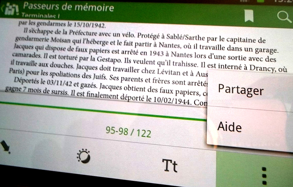 Par extension, la version e-book, si elle reste imprimable dans un format livresque plus traditionnel, offre des capacités pour des publics divers. La version sonore peut s'adapter à un public déficient visuel. Que ce soit sur tablette ou sur ordinateur, des icônes permettent une fonction loupe, grossissant à l'envi les caractères (voir annexe). Contrairement à ce que l'on pourrait penser de prime abord, la lecture sur grand écran n'a rien à envier aux petits caractères des livres papier en format de poche. Pour un lectorat âgé, comme c'est le cas des témoins de la Seconde Guerre mondiale, la version numérique permet un grossissement des caractères adapté à leur vue parfois défaillante. Le fait que des ressources sonores soient également accessibles leur offre un contact privilégié avec le contenu de l'œuvre. Au sein de leur livre numérique, les élèves de la terminale littéraire font également le choix d'intégrer un extrait d'une émission diffusée sur France Inter, "Le grand entretien", avec pour invitée Marceline Lordidan-Ivens, jeune résistante déportée. Mises à leur disposition par Jackie Pouzin sur la plateforme collective, les cinq heures de ce témoignage titanesque ont pu être écoutées et réécoutées en dehors du temps scolaire. Alors, les élèves ont sélectionné un passage descriptif du voyage en wagon à bestiaux, en conscience. Pour son texte lu, Océane choisit d'employer le pronom personnel de la première personne je, pour redonner vie aux paroles entendues du dernier voyage d'un déporté vers l'enfer concentrationnaire : "Je vis défiler le nom des dernières villes françaises".