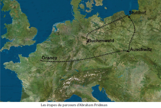 En naviguant sur le livre numérique Passeurs de mémoires, le lecteur traverse l'histoire avec une imprégnation visuelle et auditive forte. En effet, tout au long de l'année, les lycéens de terminale L sont devenus auteurs-journalistes de terrain. Dès le lancement du projet, fin septembre, les modalités de production du e-book sont précisées. Par groupes de deux, les élèves vont s'engager dans l'écriture du livre multimédia articulé autour de sept thématiques, correspondant aux sept étapes majeures vécues par Abraham Fridman : la vie à Paris, Drancy, Auschwitz, Birkenau, Struthof, Buchenwald, le Lutécia (voir annexe). Chaque binôme d'élèves choisit une de ces thématiques et se charge d'en écrire le contenu à partir de multiples documents et des témoignages rencontrés. Sur les heures d'AP (aide personnalisée) ou chez eux en autonomie, ils doivent constituer la trace écrite d'ici fin février : trois paragraphes, auxquels se réfèrent plusieurs liens interactifs (écoute d'interviews, extraits de documentaires, annexes cartographiques...). Le contenu n'est pas exhaustif, l'enjeu consiste bien à mettre en exergue les possibilités complémentaires du numérique, en corollaire d'un projet profondément humain. Dès le mois d'octobre, Abraham Fridman vient au lycée, devant les élèves, pour une conférence pleine d'émotion. Il vient à la rencontre de la classe et d'autres lycéens, le temps d'une conférence-témoignage. Les adolescents prennent leurs premières notes, posent de multiples questions. Monsieur Fridman retrace, à soixante-dix années d'intervalle, son parcours hors du commun. Pendant la guerre, il vit à Paris. Il est arrêté le 22 juillet 1944 pour être interné à Drancy, puis déporté à Auschwitz par le convoi du 31 juillet 1944 (le dernier !). Ce convoi comprend mille trois cents personnes dont trois cents enfants. L'exposition "C'étaient des enfants" 2 de l'hôtel de ville de Paris évoque cet épisode douloureux. Une semaine après la rencontre-conférence avec Abraham Fridman, fin octobre, toute la classe part à Paris pour s'immerger dans cette exposition, puis au mémorial de la Shoah. Les binômes poursuivent leur travail de relevé d'informations et de prises photographiques. Peu à peu, les traces écrites des sept chapitres se profilent, relues et étayées par l'enseignant. En février, le groupe visite le nouveau mémorial de Drancy, où un nouveau survivant déporté, Jacques Altman, leur évoque son passé poignant. Des prises de son viennent immortaliser la rencontre. Enfin, en mars, c'est à Auschwitz, puis à Buchenwald et enfin au camp de Struthof que la classe suit le sillage d'Abraham Fridman. Le projet est devenu partie intégrante du groupe-classe, car selon Jackie Pouzin, "un témoignage vécu, et vivant, est toujours bouleversant". Des cartes illustrent également le propos, enrichies après corrections et commentaires des autres membres du groupe. Si une certaine liberté pour construire le chapitre est laissée à l'initiative des élèves, chacun doit néanmoins reformuler ou consolider son contenu en fonction des remarques des camarades qui relisent également le travail des autres. Ceux-ci le font spontanément lors des heures d'AP, tel un comité éditorial, ou à tout autre moment de la journée. Ainsi, cette carte de déportation plus que sommaire, survolée, a été modifiée sur logiciels de cartographie (géoportail comme image de fond puis édugéo en montage) pour trouver une place digne de ce nom dans le livre collectif. De lui-même, l'élève auteur a pu constater la trop grande légèreté de son travail et y remédier, en progressant sur sa maîtrise des outils numériques. L'aide personnalisée trouve ici tout son sens.