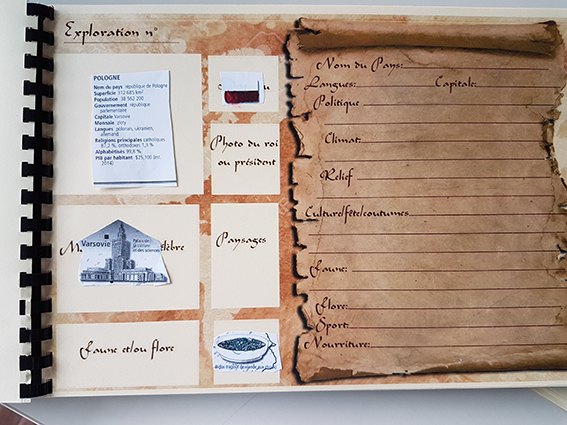 Chaque élève dispose d’un carnet d’explorateur qu’il complète en fonction de ses recherches et trouvailles. Il s'agit d'un beau carnet qui va recueillir toutes les découvertes sur un pays : de ses symboles jusqu'à ses atouts touristiques, l'élève y inscrira aussi ses démarches (courriers, récits, anecdotes, etc.) et y présentera l'équipement complet qu'il s'est offert pour explorer ce pays. Une fois achevé, ce carnet restera à disposition de la classe pour que chacun puisse sur du temps libre revenir vers un pays présenté par un pair.
