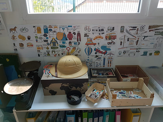 Le projet rassemble des documents collectifs disposés au fond de la classe : planisphère, support mural des bourses individuelles, magasin rassemblant tous les équipements commercialisés pour ce projet, etc. Chaque explorateur possède son propre cahier d’explorateur.