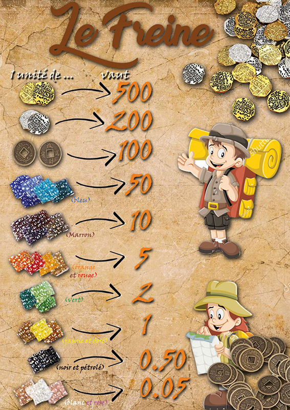 "Pour parfaire leur équipement, les élèves vont devoir troquer leurs ceintures, leurs blasons et appréciations du plan de travail obtenus dans la semaine contre des freines, la nouvelle monnaie de la classe, explique Hélène Guerrier. Ce nom pour la monnaie virtuelle de la classe a été inventé et retenu car il est en lien avec le nom de l’école (Elise Freinet), et son attaque est proche de celle du nom 'franc'. Les élèves ont chacun une petite bourse et un carnet de bon de commande, on fait ainsi un lien avec les mathématiques. Ils pourront ainsi obtenir leurs accessoires, les collectionner et les coller sur leur carnet."