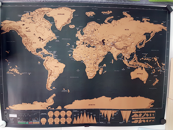"Concernant les explorations, nous avons une carte du monde à gratter pour suivre l'évolution des découvertes de la classe." Il s’agit d’un planisphère sur lequel les pays sont recouverts d’une fine pellicule que l’on va gratter lorsque le pays aura été exploré. "C’est un vrai moment de bonheur pour les élèves que de dévoiler leur pays", explique Hélène Guerrier. Ainsi, progressivement, tous les pays explorés apparaîtront, mettant en évidence les pays encore non explorés.