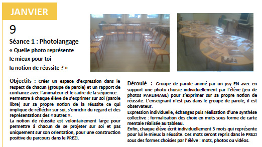 La séance sur le photolangage ressemble à des séances habituelles pour des psychologues. Émeline Renault explique que grâce à quelques images, les élèves vont pouvoir s'exprimer de manière libre et autonome. La synthèse collective complète le travail de réflexion de l'élève car les autres peuvent lui donner de nouvelles idées. Même si son approche privilégie l'individu, la PsyEN précise que le groupe a aussi ses avantages comme l'émulation.