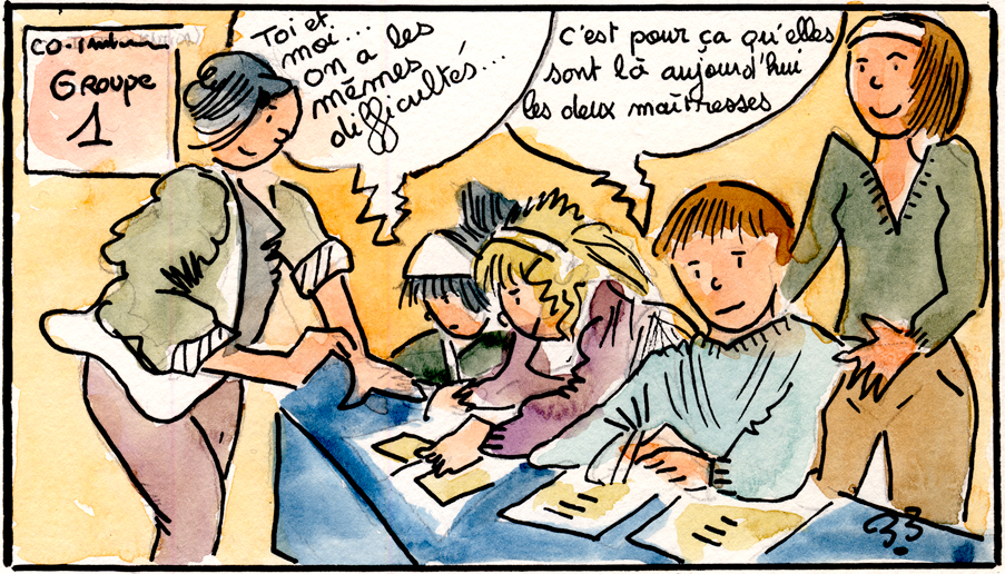Selon l’organisation adoptée pour l’année, chaque enseignante du dispositif est donc susceptible de devenir à son tour personne-ressource de l’école, acceptant de céder sa classe durant une période. Ainsi Aurore C, enseignante en CE2, a-t-elle été "PE+" l’an passé, laissant cette année cette fonction à Aurore Bergère, enseignante de CE1. Cette organisation amène chacun à repenser ses missions au sein de son école. Cette réflexion professionnelle aura été plus prégnante encore pour Janine : ex-maîtresse spécialisée de Rased (Réseau d’aides spécialisées pour les élèves en difficulté), elle intervient comme enseignante à temps plein, successivement dans deux classes, entre novembre et mai, laissant à chacune des périodes impaires sa place "PE+" à l’une de ses collègues. Elle suit alors la programmation prévue par la titulaire de la classe. C’est une belle gymnastique intellectuelle puisque pour ces périodes, elle change de classe et de niveau : en période 2 elle enseigne en CE1 et en période 4 elle enseigne en moyenne-section de maternelle. Quant aux parents, ils ont bien accepté ce système d’alternance de fonctions, informés que pendant une période, la classe est dirigée par un autre PE que la titulaire de la classe.