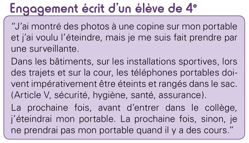 Car c'est justement à une incitation patiente et répétitive que se livre la principale. Pour cela, elle utilise l'oral, l'écrit (voir annexe), et parfois les deux combinés pour confronter deux versions ou montrer à l'élève comment sa perception d'un événement évolue dans le temps. Parfois, c'est un dessin qu'elle demande à l'élève afin de jauger la représentation qu'il a d'un incident : il s'agit de dessiner le lieu, la place des protagonistes, d'indiquer les gestes. Cet outil est particulièrement intéressant quand plusieurs élèves sont impliqués dans un problème ou qu'ils ont du mal à s'exprimer. Confronter les dessins incite à parler, à s'expliquer. Il arrive d'ailleurs que deux élèves soient entendus ensemble. Pour inciter chaque élève à clarifier sa démarche, celui qui écoute doit reformuler les propos de son camarade. Quand plusieurs élèves sont impliqués, le chef d'établissement reçoit les protagonistes individuellement, puis collectivement, afin de confronter les versions orales ou/et écrites. C'est ainsi que, parfois, une autre vérité apparaît : celui qui a fait la bêtise a été incité par des camarades et sera peut-être moins sévèrement sanctionné. À l'issue des entretiens, il peut être décidé d'associer la famille à la démarche si l'on estime que ce peut être positif pour l'élève. Dans tous les cas, suite à la ou aux discussions, une sanction en phase avec le problème est posée : l'entretien vise aussi à rappeler à l'élève ses droits et ses devoirs. Le dernier entretien qu'a mené madame Thiébault concernait un élève qui, pour jouer, a serré le cou d'un camarade conduit ensuite à l'hôpital. L'élève responsable a été très choqué par l'intervention des pompiers, il n'avait pas mesuré sa force, n'avait pas l'intention de faire mal. Il a accepté d'expliquer son geste, mais ne parvient pas à mettre en lien la cause et la conséquence. C'est le début d'un travail, d'une série d'entretiens ; il va falloir amener cet élève à prendre conscience que sa force physique peut nuire à autrui. Du côté de la direction et de l'équipe éducative, on réfléchit aux moyens de l'y amener. La réussite n'est jamais acquise.