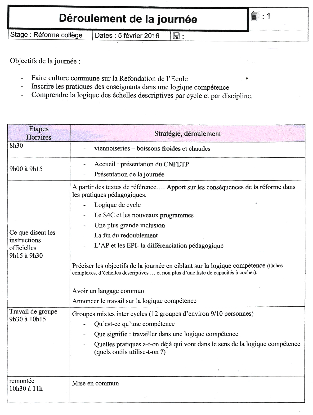 Dès février 2016, pendant une journée pédagogique consacrée à la réforme et commune au collège et aux écoles primaires du secteur, une place centrale a été accordée à l'évaluation par compétences. Comme on peut le voir sur le document de déroulement de la journée, c'est même le fil rouge de la journée : "annoncer le travail sur la logique de compétence". Après un premier temps d'échanges inter-cycles entre les enseignants du primaire et du secondaire, la réflexion a été nourrie par des intervenants extérieurs ("apport"). Des indicateurs, des outils et une première méthodologie ont été apportés. Cette journée a participé au lancement d'une dynamique en faveur de l'évaluation par compétences.