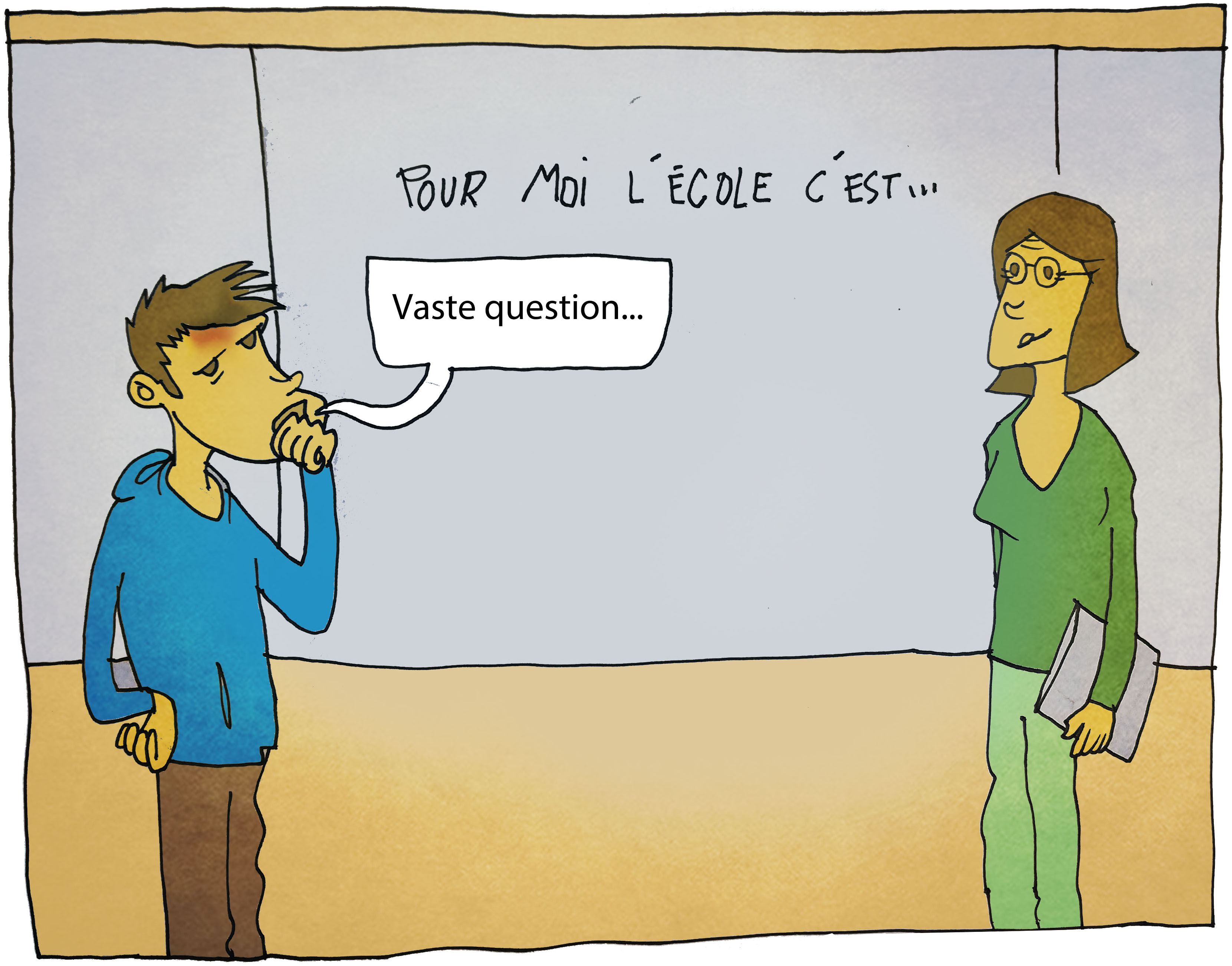 Une des séances proposées a pour objectif de déconstruire les idées négatives qu'ils ont, pour la plupart, de l'école et leur proposer un travail de recul sur soi. Quelle est leur part de responsabilité dans la réussite à l'école ? L'apprentissage d'un élève ne dépend - il que des professeurs ? L'école n'apprend-elle que la théorie et pas la vie ? L'école n'a-t-elle pas pour but d'enseigner aussi à être responsable ? Qu'apprend-on véritablement à l'école, des connaissances, des compétences, à vivre ensemble ? Afin de clarifier leurs représentations, de lever les doutes, les deux professeures interrogent donc leurs élèves sur le sens qu'ils accordent à l'école.